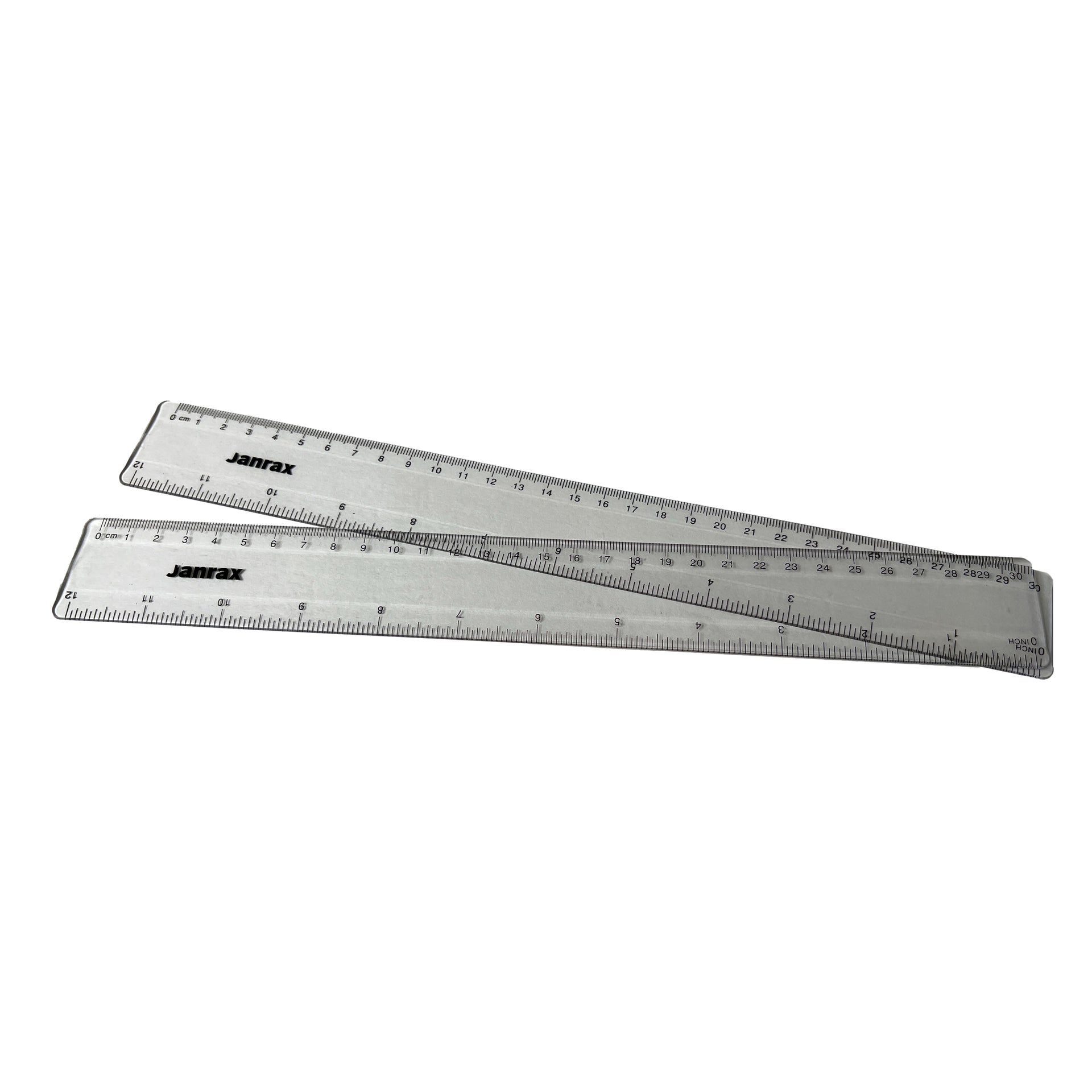 30cm Transparent Plastic Ruler by Janrax. Light and Durable ruler with cm and inch measurements. Measurements to 30cm/12". Perfect for home, office and school use.