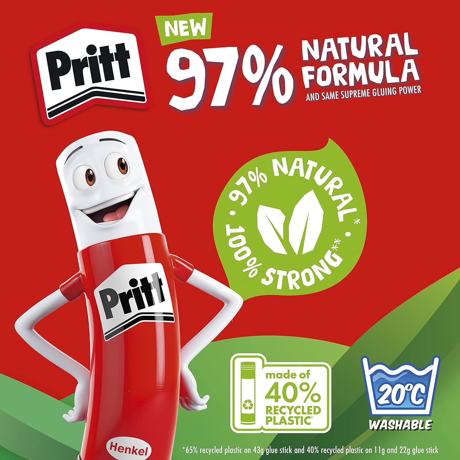 Pritt Stick Glue Stick 43g (Pack of 24) 1564148. Quick and easy. Clean and washable at 20 degrees. Solvent free. Acid free and non-toxic. Fully compliant to European toy safety standards - EN71 - CE marked. 43g.