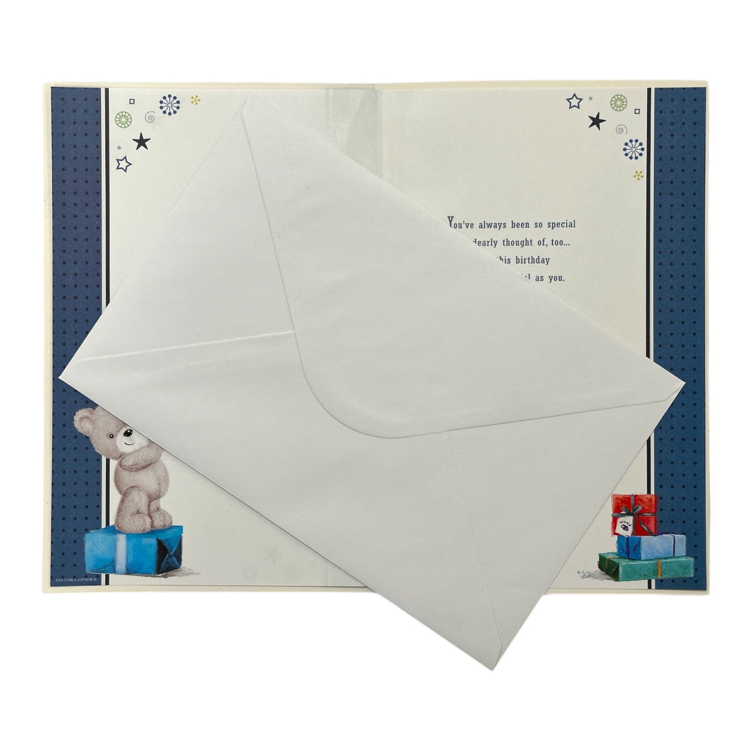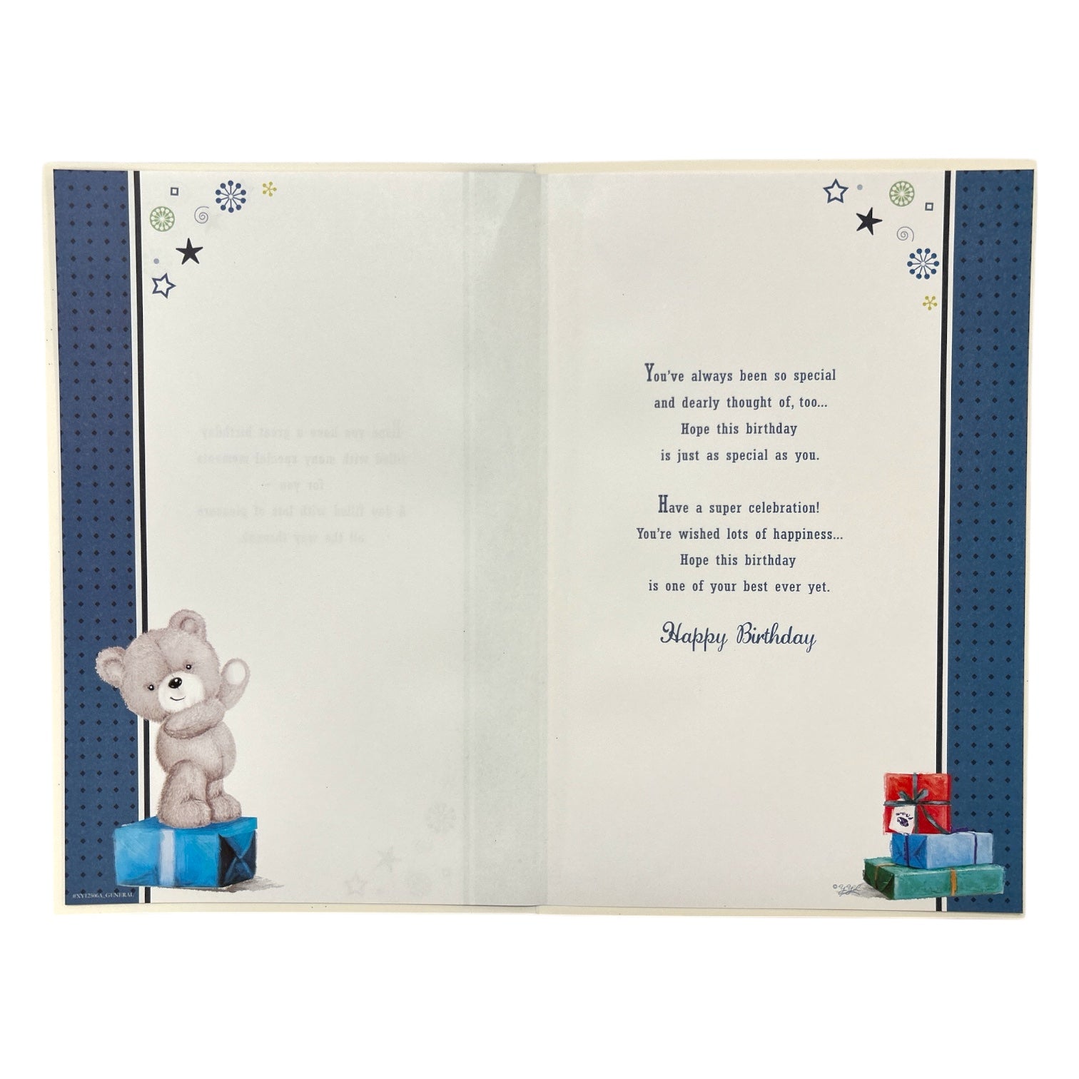 This 18th Birthday Card features a delightful teddy bear standing on top of colorful gift boxes. The card's playful and childlike illustration is complemented by bold, fun lettering that reads "Happy 18th Birthday," making it an ideal choice for a young birthday celebrant. The card’s design is framed by a large star motif that highlights the text "Special Day," adding a festive touch. Bright, vibrant colors and a slightly glossy or shimmery effect give the card an extra touch of cheer, making it perfect for celebrating this milestone birthday. Inside, you’ll find heartfelt birthday wishes, making this card a joyful, celebratory keepsake. The card comes with a coordinating envelope. Approximate size: 27.5x18.5cm.