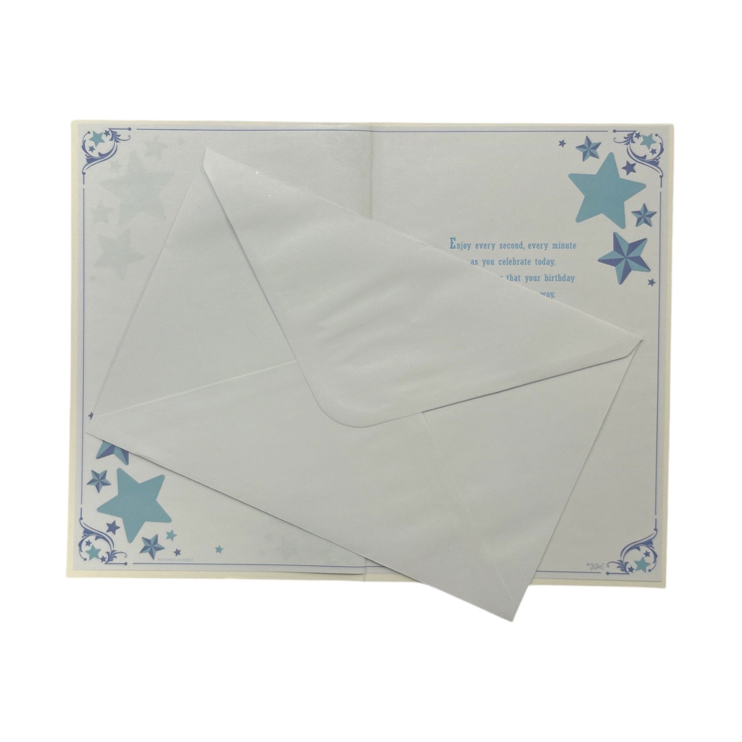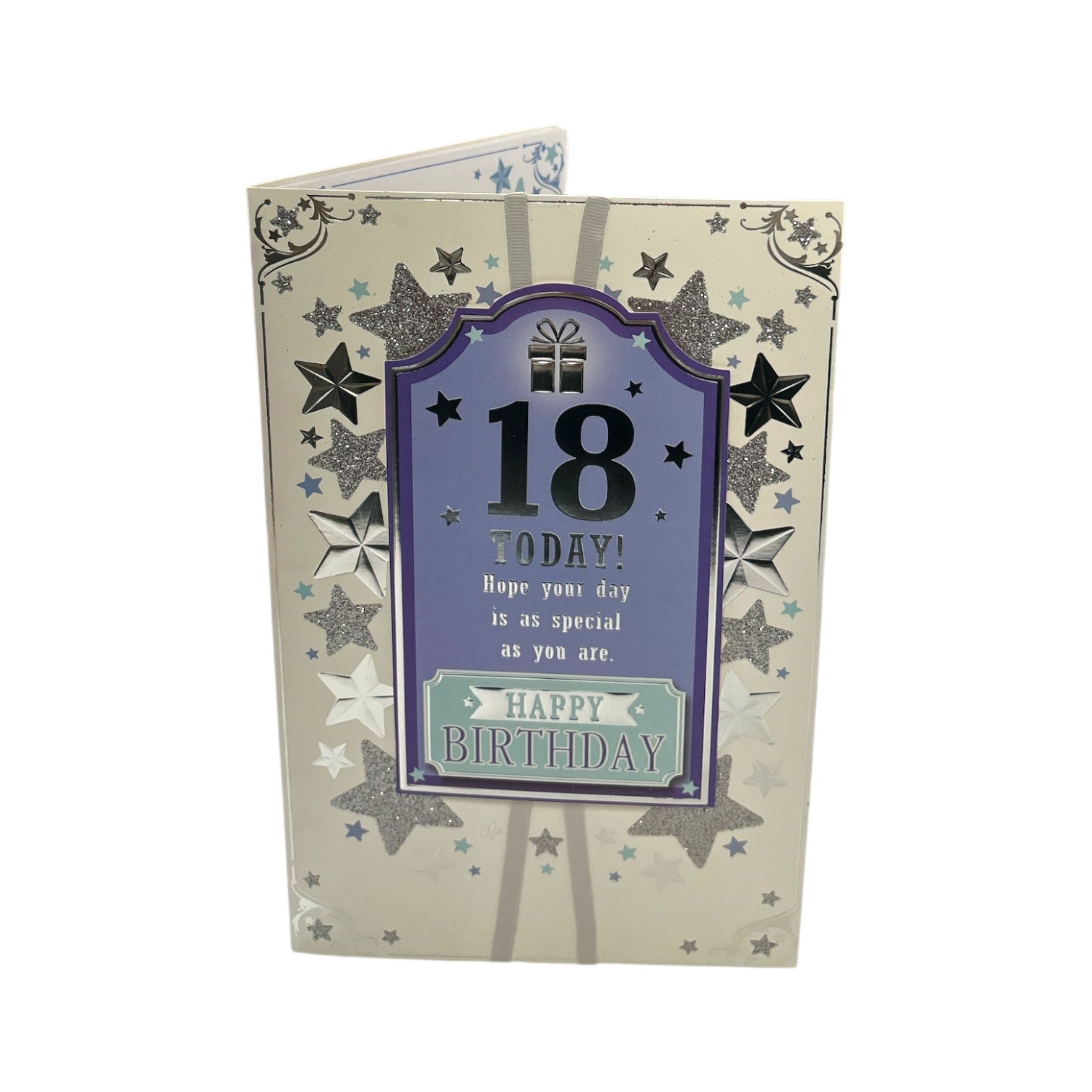 Celebrate a special milestone with this stylish and sophisticated birthday card, designed to make turning 18 truly memorable. The card features a cream-white background, elegantly adorned with silver glitter stars, creating a dazzling and festive look. At its center, a lavender-purple label showcases the bold number "18", alongside "TODAY!" and "HAPPY BIRTHDAY" in a decorative, celebratory font. A silver gift icon adds an extra touch of charm, while the intricate ribbon-like accents and ornate decorative borders enhance its elegance. Inside, the card continues with wonderful birthday wishes, making it a cherished keepsake for this exciting milestone. The card comes with a coordinating envelope. Approximate size: 27.5x18.5cm.