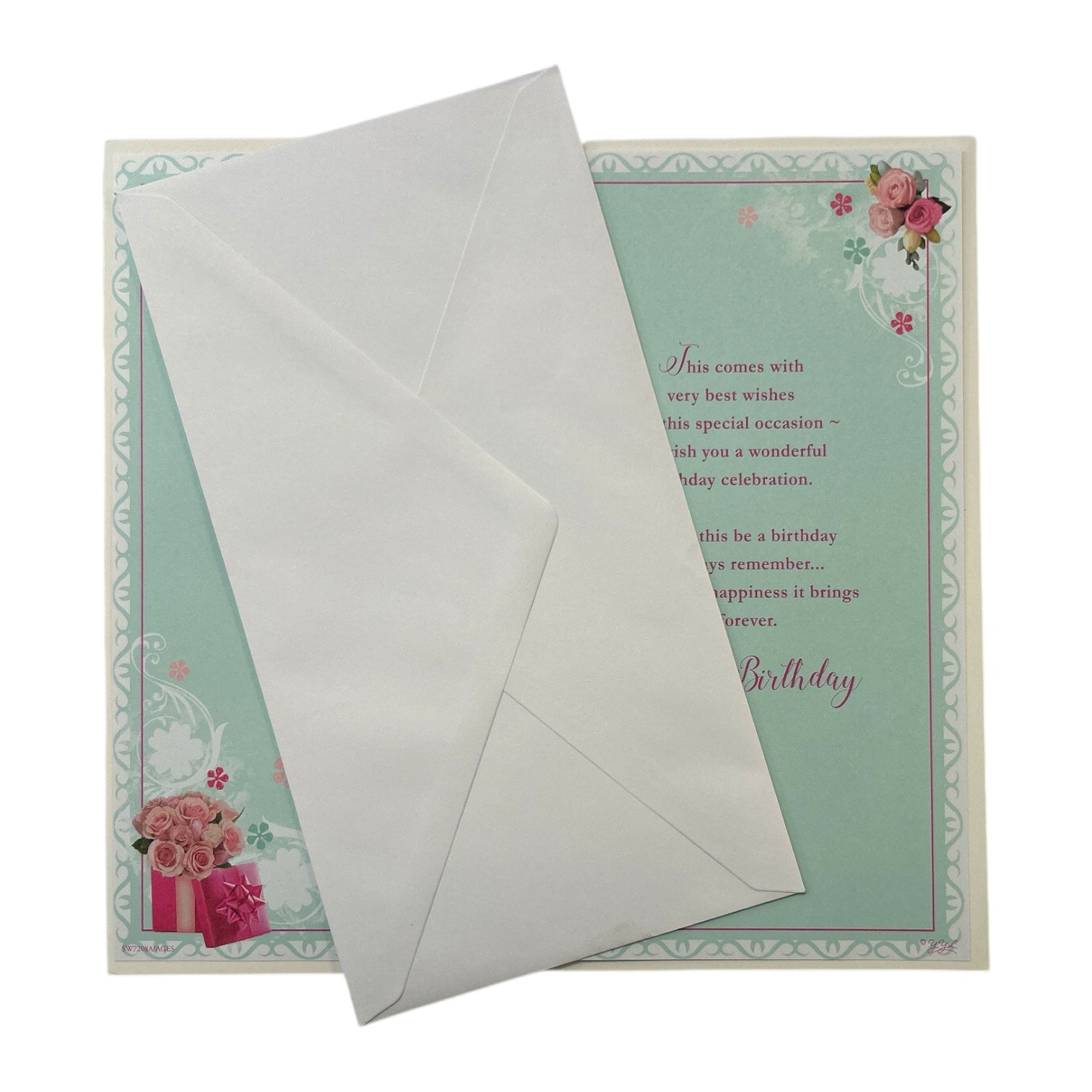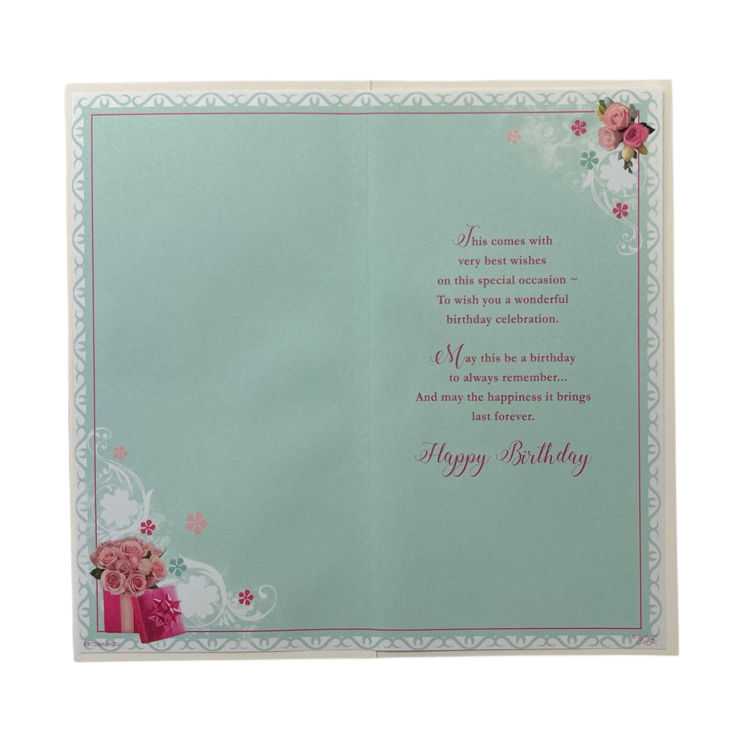 This beautifully designed birthday card celebrates a joyous 100th birthday with elegance and warmth. Set against a light cream background, the card features embossed floral and gift-box motifs in soft pink and rose tones. A decorative arch frames the heartfelt message, with the large text "Happy Birthday 100 Today!" standing out prominently. Inside the arch, flowing cursive script expresses special wishes for a remarkable milestone. The overall design is graceful and festive, making it a perfect tribute for this momentous occasion. Card size approx.: 24cm x 12cm.