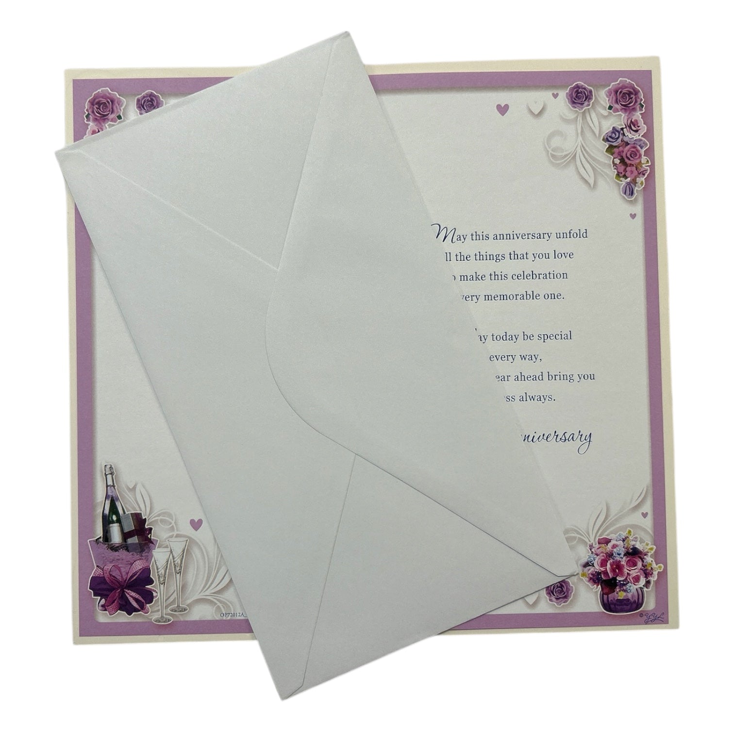 This Son and Daughter-in-Law Anniversary Card is a beautiful way to wish the couple well on their special day. The front of the card showcases a charming purple-pink flower pot alongside a champagne bottle with flutes, creating a festive and celebratory atmosphere. The elegant design perfectly conveys the joy of their anniversary. Inside, you'll find the same thoughtful design, accompanied by a lovely verse that expresses warm and heartfelt wishes for the couple’s anniversary. This card comes with a coordinating envelope. Approximate Size: 9" x 4.75" (23cm x 12cm)