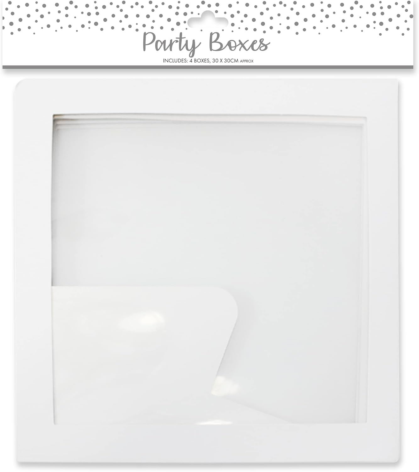 Pack of 4 Party Boxes. Pack of 4 Balloon Box Tower Stacking Balloon Cubes. White paper boxes with transparent windows. Each box is 30cm x 30cm approx. Perfect Party Decoration for any celebration. These boxex can be re-used time and time again for a variety of party displays. Perfect for Weddings, Birthdays, Baby Showers and all Themed Events and Celebrations.