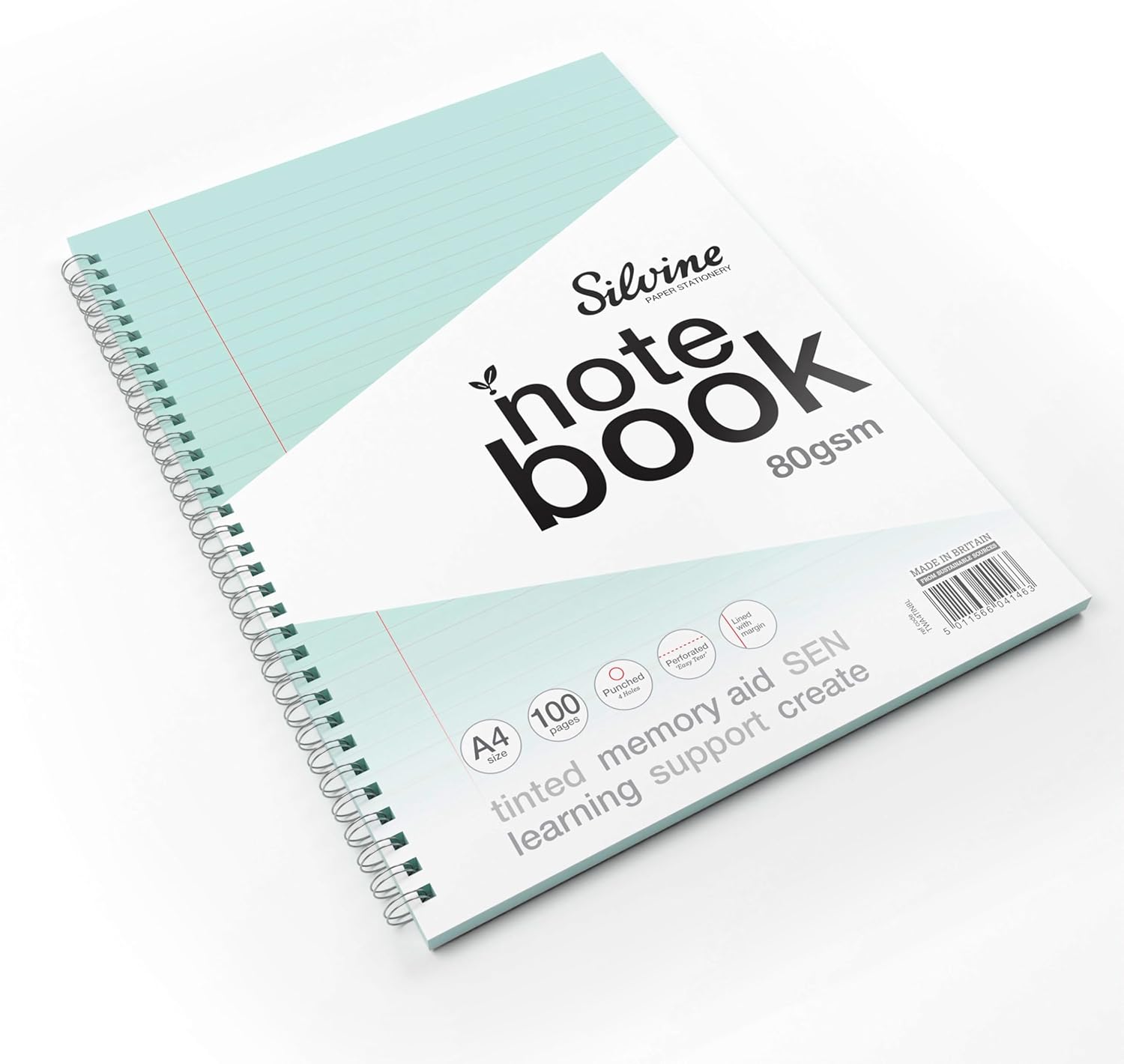 A4 notebook with 100 pages of premium 80gsm blue tinted paper to assist memory aid and SEN supportive learning. The 8mm feint ruled lines and margin fade subtly into the background as you write making words appear more prominent on the page. The wire binding allows the pad to lay flat on any page while punch holes and micro-perforations make page filing a breeze. Featuring a water resistant gloss sealed cover to help protect your notes from wear and tear or accidental spills. Made from recyclable materials, the paper fibres from this book can be recycled up to 6 times helping to protect and preserve the environment.