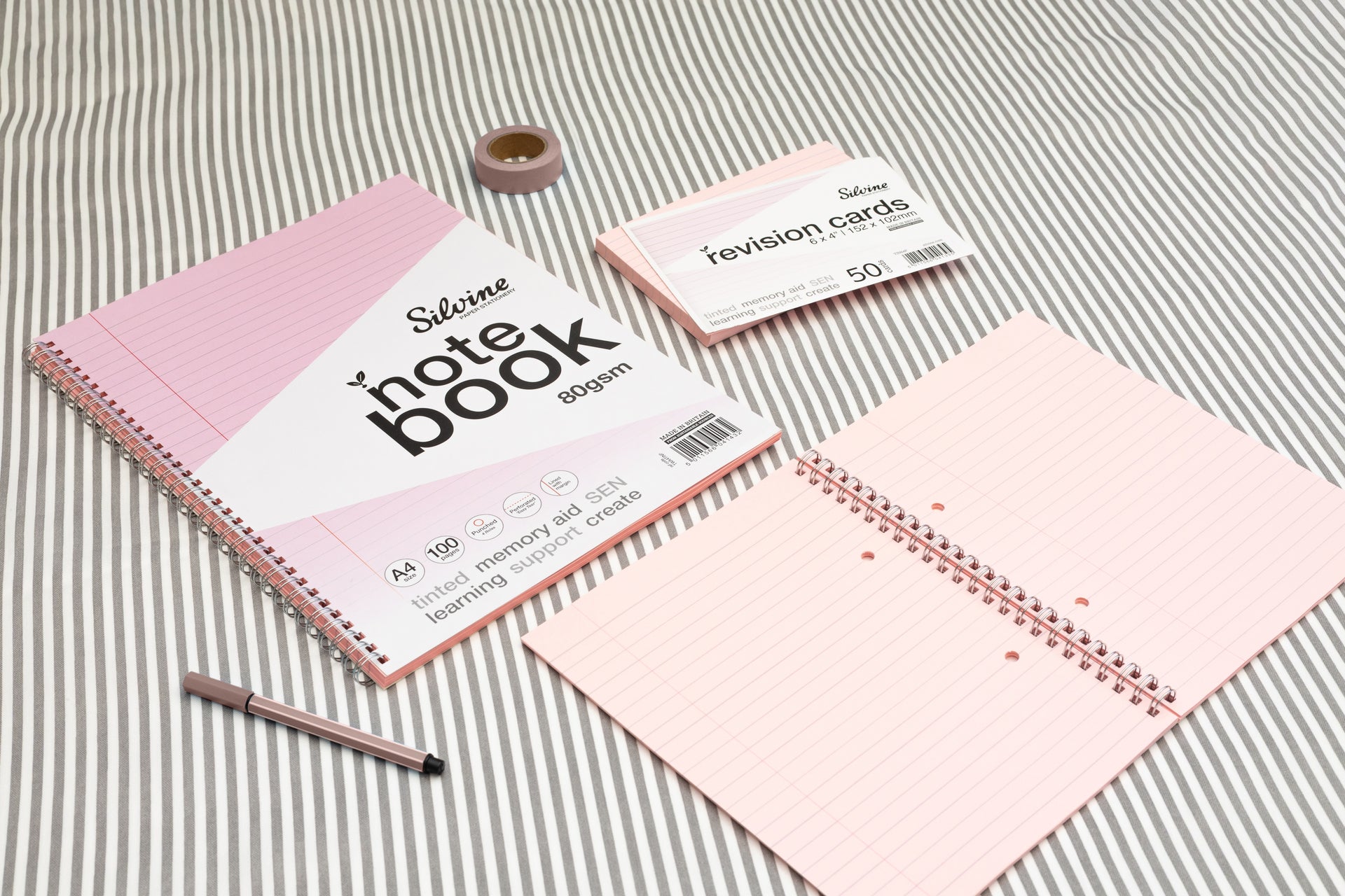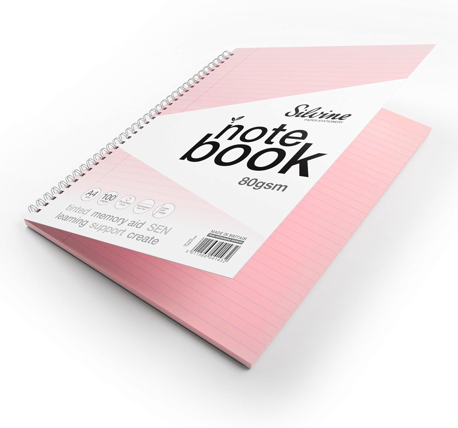 A4 notebook with 100 pages of premium 80gsm pink tinted paper to assist memory aid and SEN supportive learning. The 8mm feint ruled lines and margin fade subtly into the background as you write making words appear more prominent on the page. The wire binding allows the pad to lay flat on any page while punch holes and micro-perforations make page filing a breeze. Featuring a water resistant gloss sealed cover to help protect your notes from wear and tear or accidental spills. Made from recyclable materials, the paper fibres from this book can be recycled up to 6 times helping to protect and preserve the environment.
