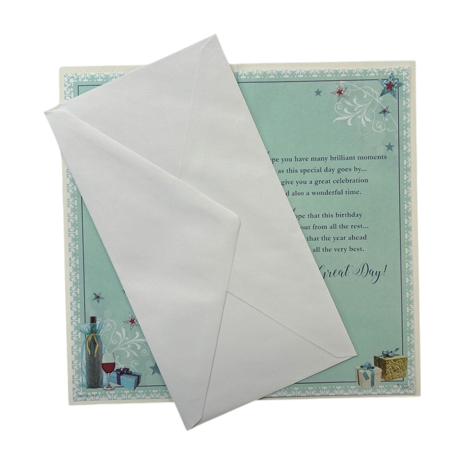 This stylish birthday card for a special Grandad's 70th birthday features a light beige background complemented by a central teal-blue panel. Within this section, a charming arrangement of small, stylized gifts, a bottle, and a wine glass is displayed, all surrounded by a decorative frame adorned with stars and subtle patterns. The design blends elegance and celebration, perfect for marking this milestone occasion. Card size approx: 24cm x 12cm.