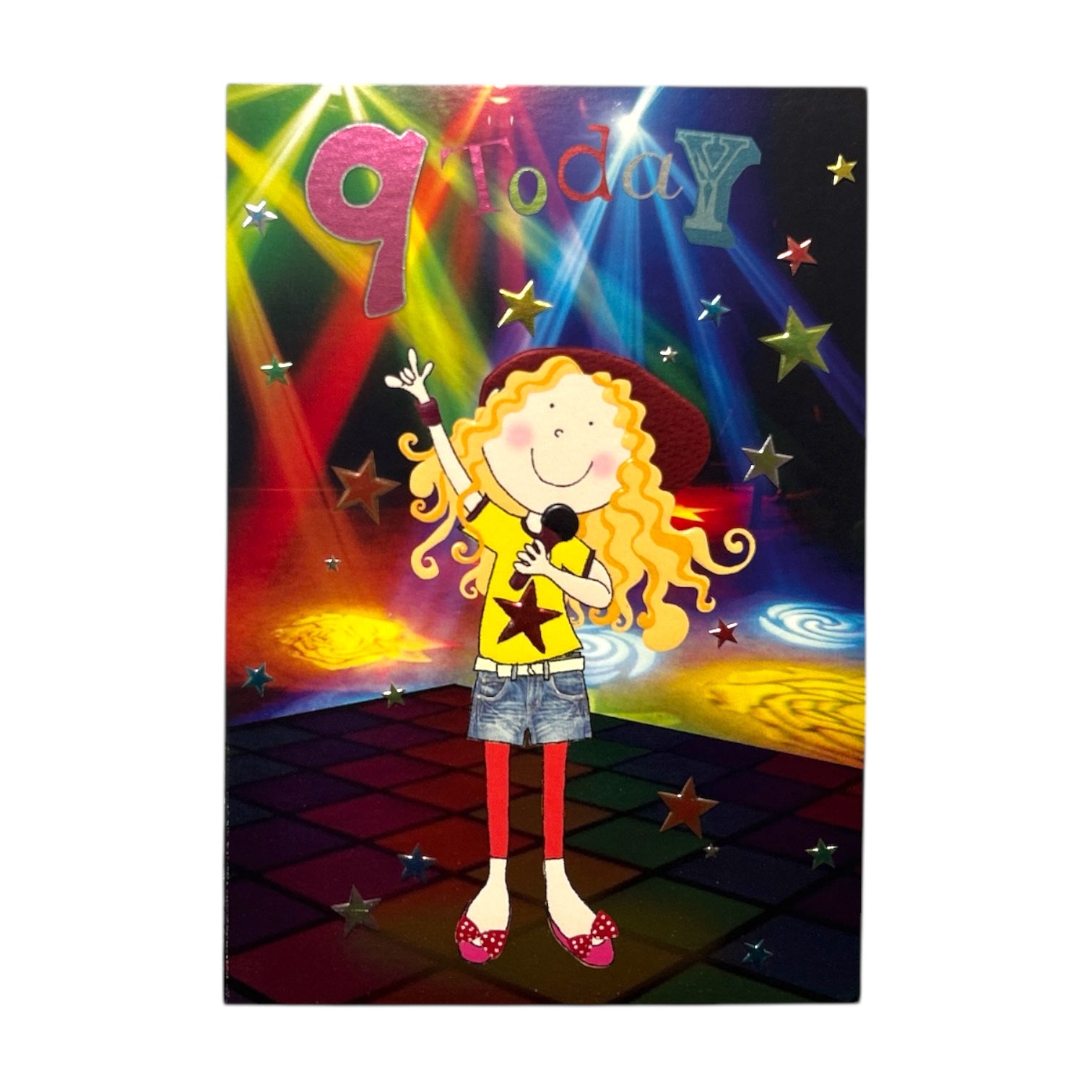 This 9th birthday card features a disco-themed stage filled with bright lights and colorful patterns, creating a fun and energetic atmosphere. At the center, a young girl with light, wavy blonde hair and a cheerful expression is depicted as a performer. She is wearing a yellow t-shirt with a red star design, denim shorts, and red polka-dot shoes. Holding a microphone in one hand and raising her other arm excitedly, she exudes confidence and joy. The background bursts with vibrant colors, including shades of yellow, red, blue, and purple, enhancing the celebratory feel. The lighting is bright and focused on the girl, making her the focal point of the design. The symmetrical composition draws attention to her joyful expression and dynamic performance, making this card a perfect choice for a 9th birthday celebration. Size 133mm x 190mm. comes With Envelope.