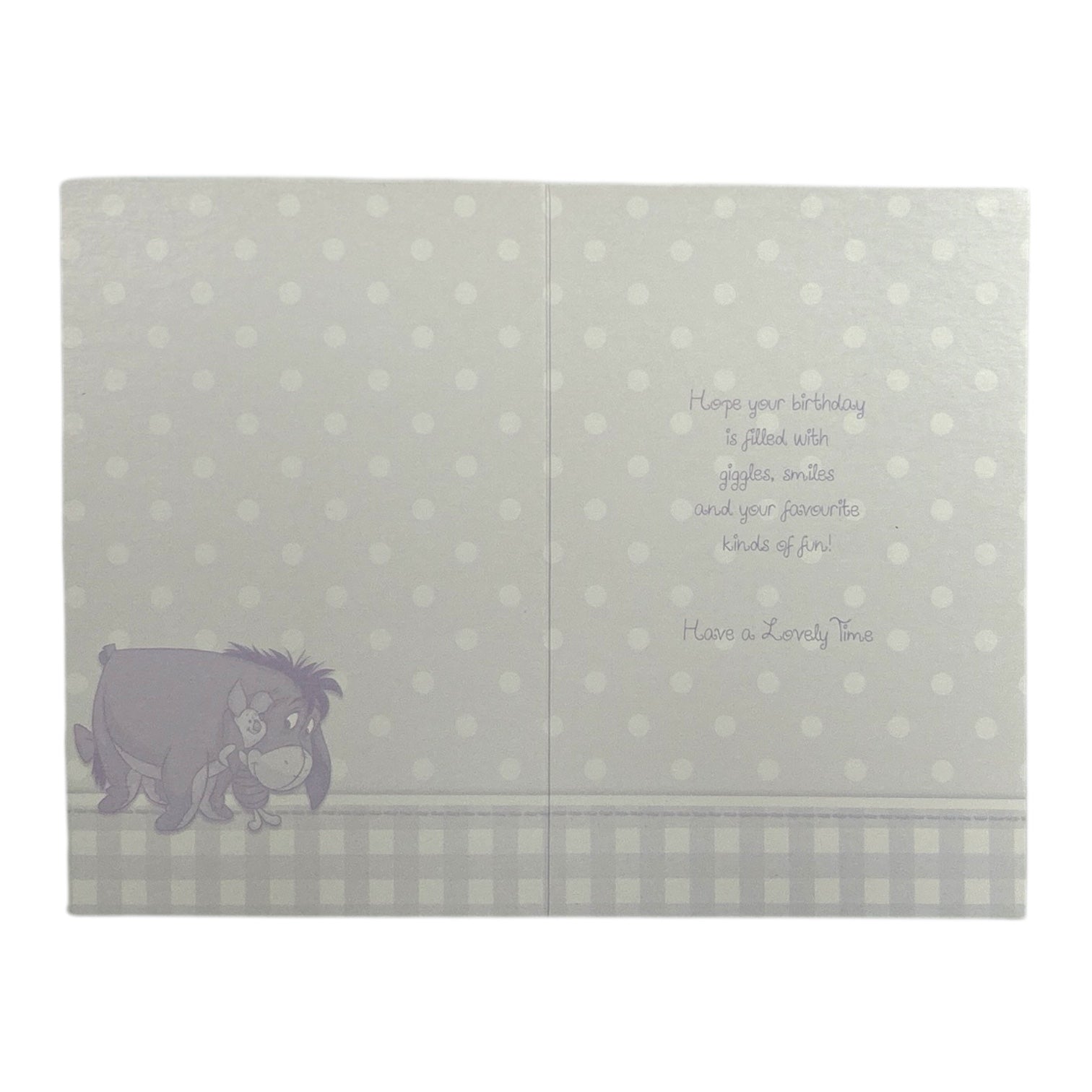 “Hope your birthday is filled with giggles, smiles and your favorite kinds of fun! Have a lovely time.” Card size: approximately 18.4 cm x 12 cm.