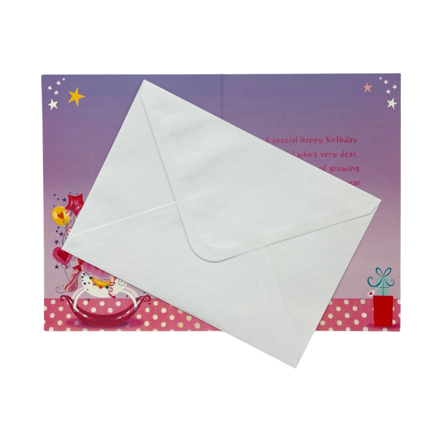 Make your cousin’s birthday magical with this whimsical and beautifully designed card. The front features a charming illustration of a girl dressed as a fairy, joyfully riding a rocking unicorn. Surrounding the scene are vibrant, foil-like stars, colorful balloons, and a delightful gift box, adding to the playful and festive atmosphere. At the top, "COUSIN Have FUN!" is displayed in a stunning embossed foil font, making the card extra special. Inside, lovely birthday wishes continue the cheerful theme. This card is the perfect way to celebrate a young girl's special day. The card comes with a coordinating envelope. Card size approx. : 19 x 13cm.