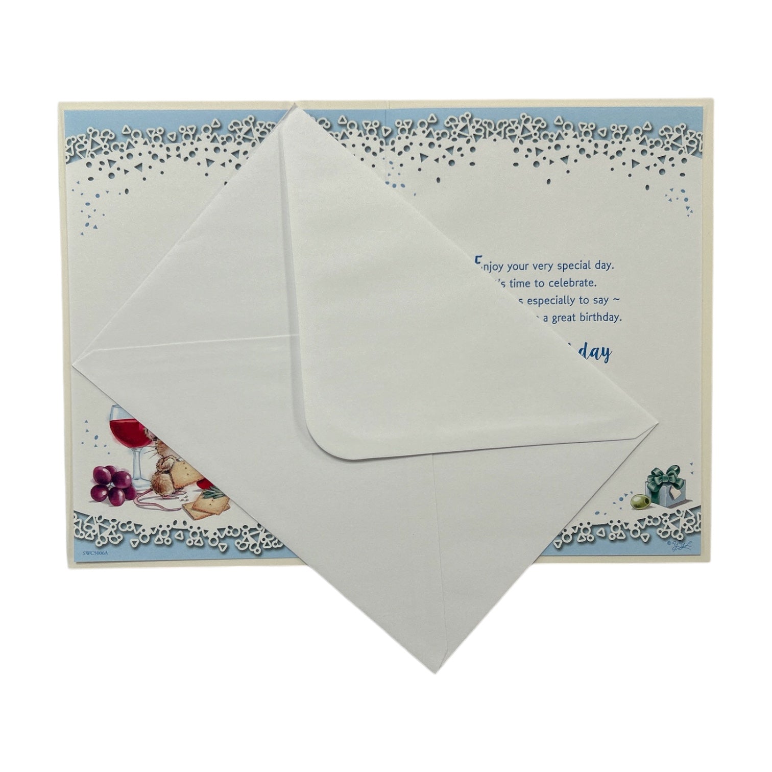 Celebrate your Husband’s special day with this charming and fun Birthday Card. The front features a cute mouse savoring a piece of cheese while sitting next to a wine glass and grapes, bringing a whimsical and joyful touch to the design. The card is beautifully embossed with intricate details and enhanced with foil accents, adding an elegant shine. Inside, you'll find warm Birthday Wishes, expressing your love and appreciation for your husband. This card is the perfect way to make his birthday celebration even more memorable. The card comes with a coordinating envelope. Card Size: Approx. 19.5 x 14 cm.