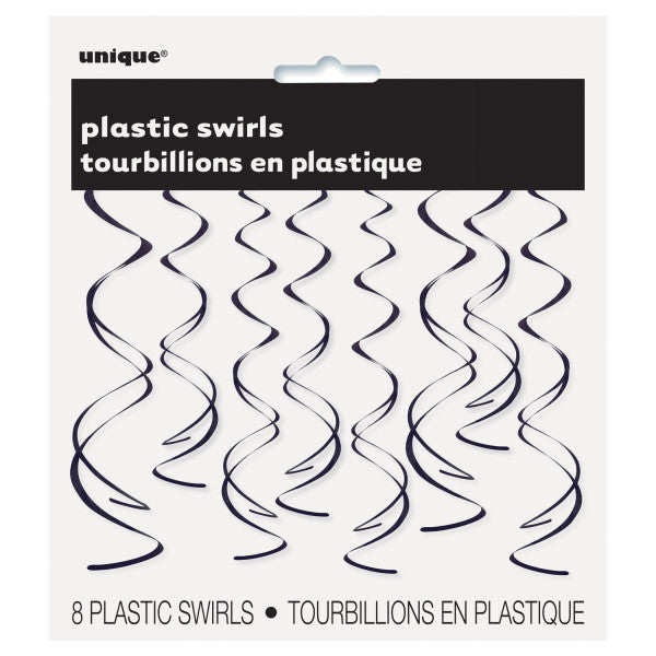 Pack of 8 Black Solid Hanging Swirl Decorations. These hanging decors feature black plastic swirls that measure 26 inches long. This product is great for your party decors on birthdays, bridal showers, and other fun events. This product is made of brightly-coloured and durable plastic material. These hanging swirls are easy to assemble, install, and can be stored and re-used.