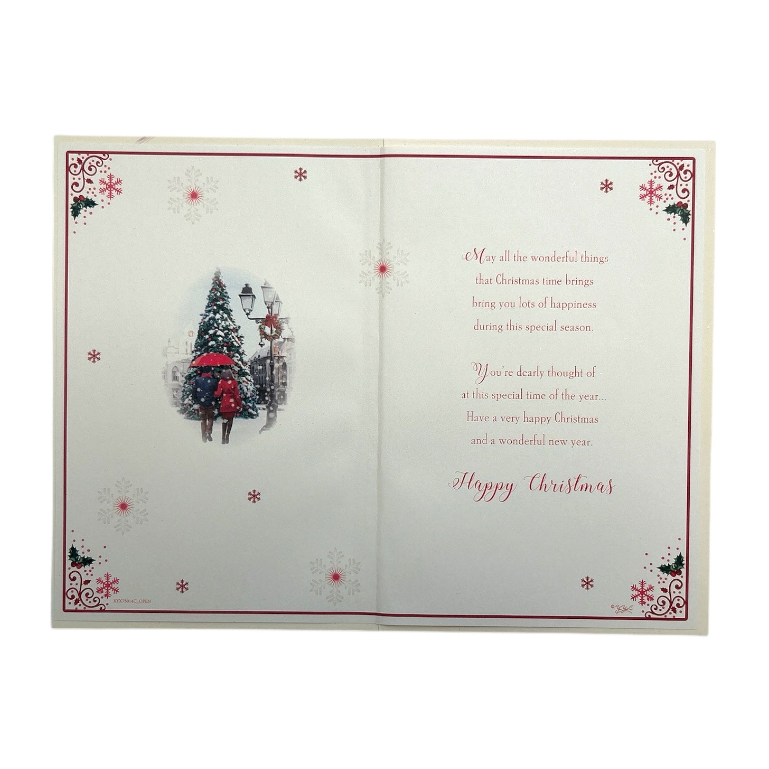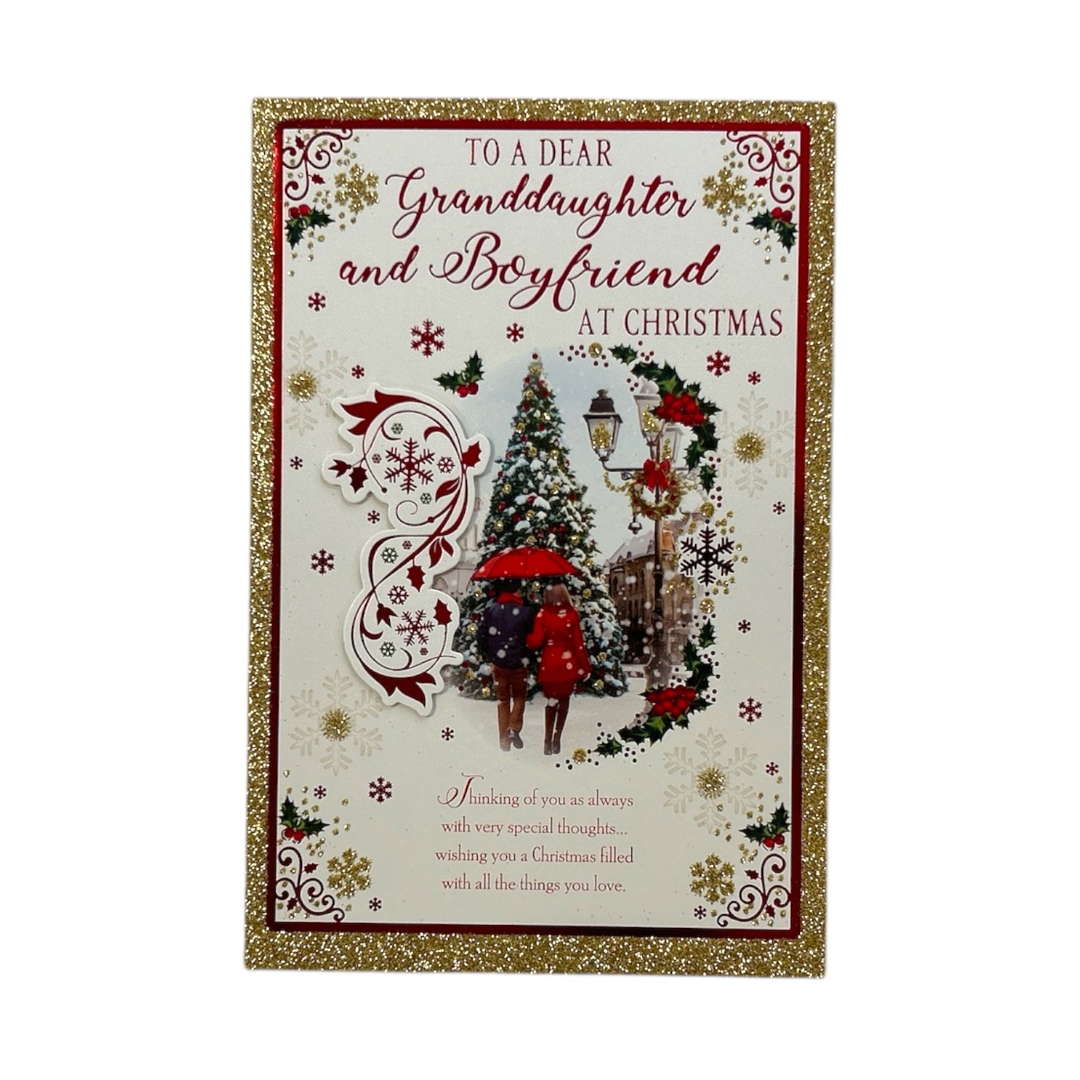 To a Dear Granddaughter and Boyfriend Snowy Village Scene Christmas Card. A beautifully festive Christmas card featuring a snowy village street, where a granddaughter and her boyfriend walk under an umbrella near a decorated Christmas tree. The scene is enhanced with floral patterns, holly, snowflakes, and a shimmering gold border, creating a joyful and celebratory holiday feel. Warm tones and festive details complete the design, making it a perfect way to share love and Christmas wishes. Approx. size 225 x 155mm, supplied with a coordinating envelope.