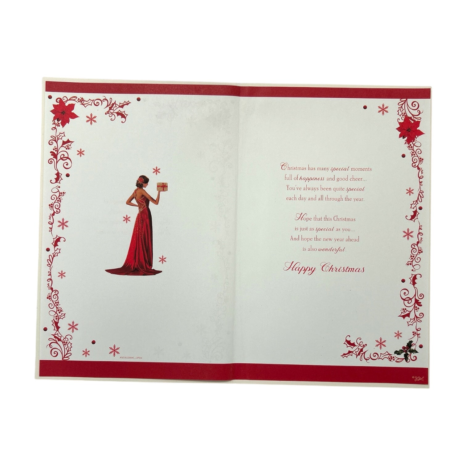 Send festive cheer to your niece with this beautifully designed Christmas card. The card features a decorative frame with ornate scrolls, snowflakes, holly, and berries surrounding the words “For A Dear Niece At Christmas Time.” A woman in a red dress stands beside a beautifully decorated Christmas tree, holding a gift, set within a glittering red rectangular border. This charming design captures the warmth, joy, and festive spirit of the season. Approx. size 275 x 175mm, supplied with a coordinating envelope.