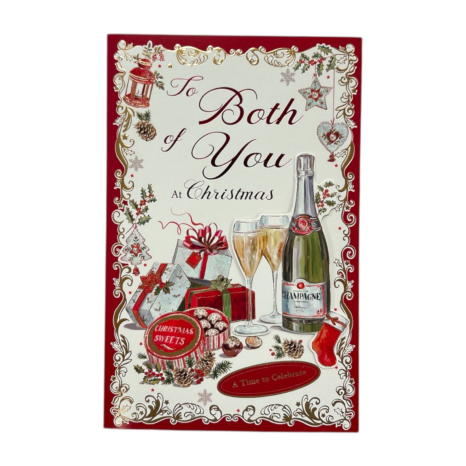 To Both of You Christmas Card – This elegant Christmas card features a festive scene with a bottle of champagne and two glasses, framed by ornate gold-edged borders against a rich red background. Surrounding the champagne are Christmas-themed decorations, including gifts, holly, garlands, and Christmas trees, creating a warm and celebratory arrangement. The design captures the spirit of togetherness and festivity, making it perfect for sending warm wishes to both of you. Approx. size 275 x 175mm, supplied with a coordinating envelope.