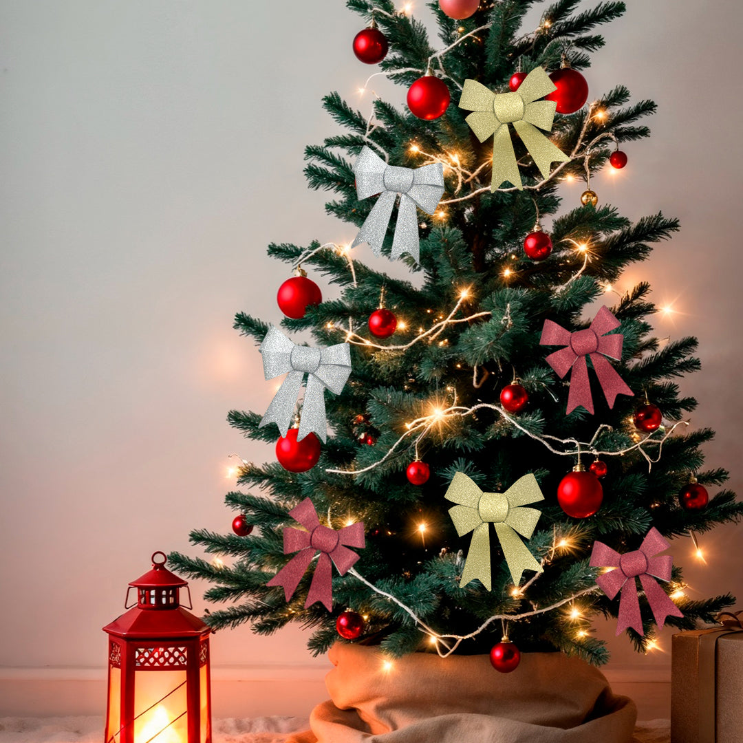 Pack of 3 Red Christmas Present Gift Bows. 3 Pack Red Present Bows are designed to provide a decorative finish for gift wrapping and seasonal packaging. Each bow features an 11cm width with formed loops and 8.5cm tails for consistent presentation. The bows are made from glimmer-coated paper in a red shade suitable for occasions such as Christmas, New Year, birthdays, weddings and anniversaries. They can be applied to gift boxes, bags and wrapped parcels. This pack includes 3 matching red bows supplied on a display card for ease of storage and use.