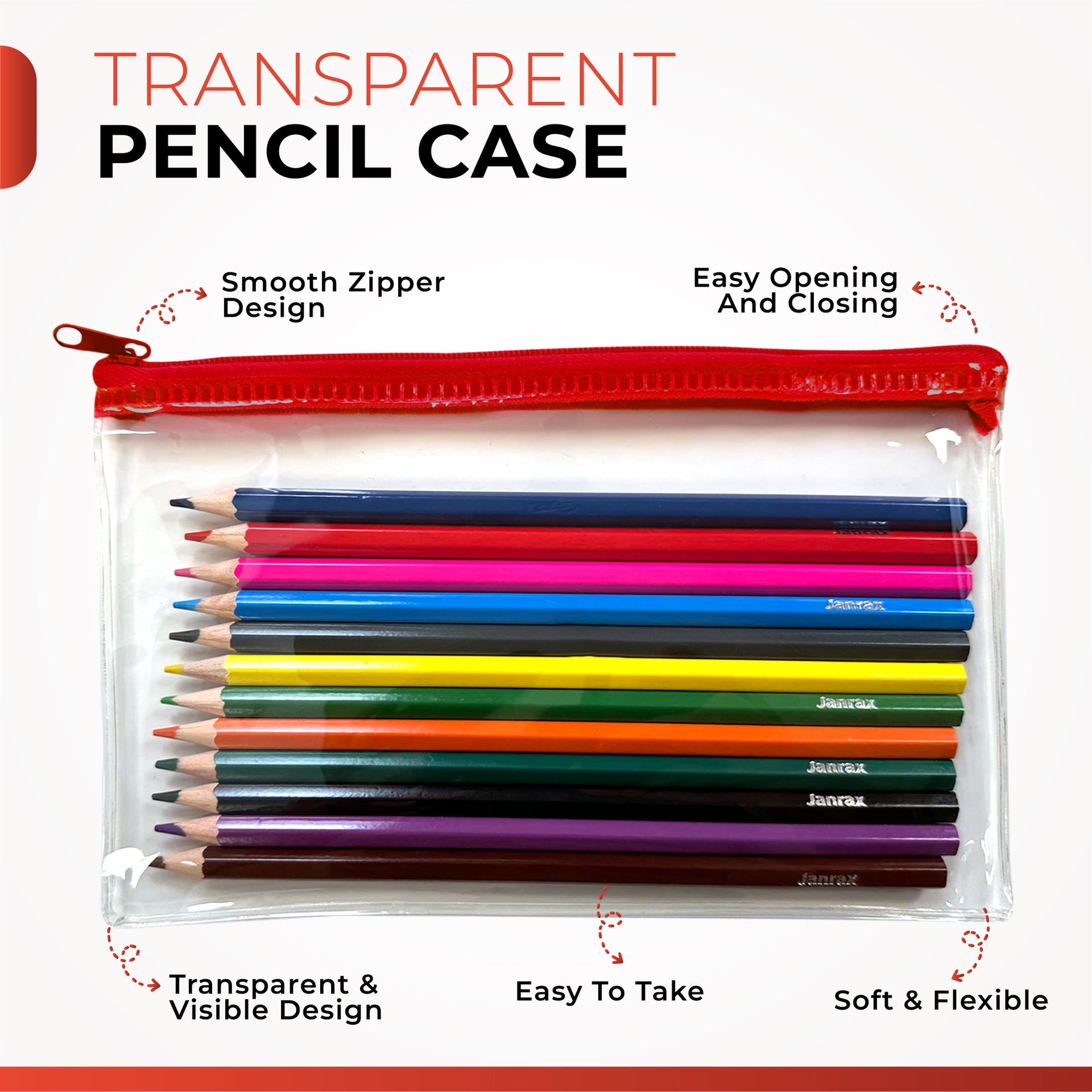 Pack of 12 Colouring Pencils in White Zip Clear Pencil Case. Includes: Pencil case and 12 colouring pencils. Pancil case size: 8x5". Transparent Pencil case made from 200 micron PVC ideal for exams and to store everyday school supplies. Quality pre-sharpened coloured pencils feature a strong and durable lead that delivers smooth, consistent lines on various paper surfaces. Crafted with utmost care ideal for school classrooms, studios, artists and activities. Colours include for colouring pencils are Black, Grey, Brown, Red, Yellow, Orange, Purple, Blue, Light Blue, Green, Light Green and Pink.