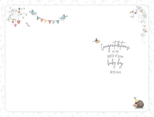 Bear In Basket With Fox Birth Of Boy Congratulations Card