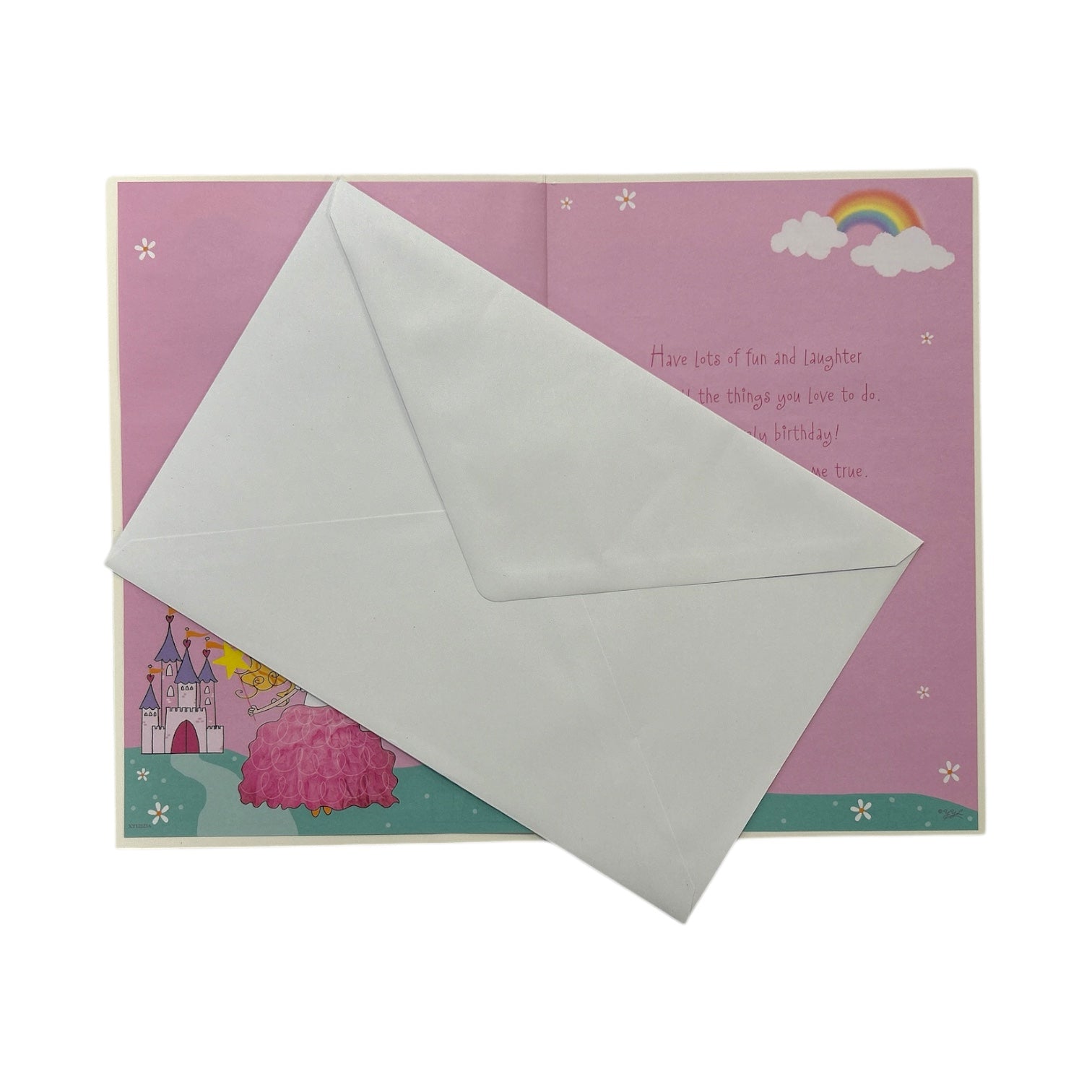 Celebrate a magical milestone with this adorable princess-themed birthday card! The front features a young girl in a glittery pink dress, wearing a crown and holding a magic wand. Beside her is a cute white cat, adding to the enchanting scene. She stands proudly in front of a pink castle, with a backdrop of fluffy clouds and a vibrant rainbow, creating a fairy-tale atmosphere. The text "You're 3 Today Daughter" and "Birthday" is beautifully designed in multicolored glitter, adding extra sparkle to the card. Additionally, a large, round badge with the message "3 Today" adds a fun touch, making this card extra special for your Daughter. Inside, you'll find warm birthday wishes that are sure to bring a smile to his face. The card comes with a coordinating envelope. Approximate size: 27.5 x 18.5.