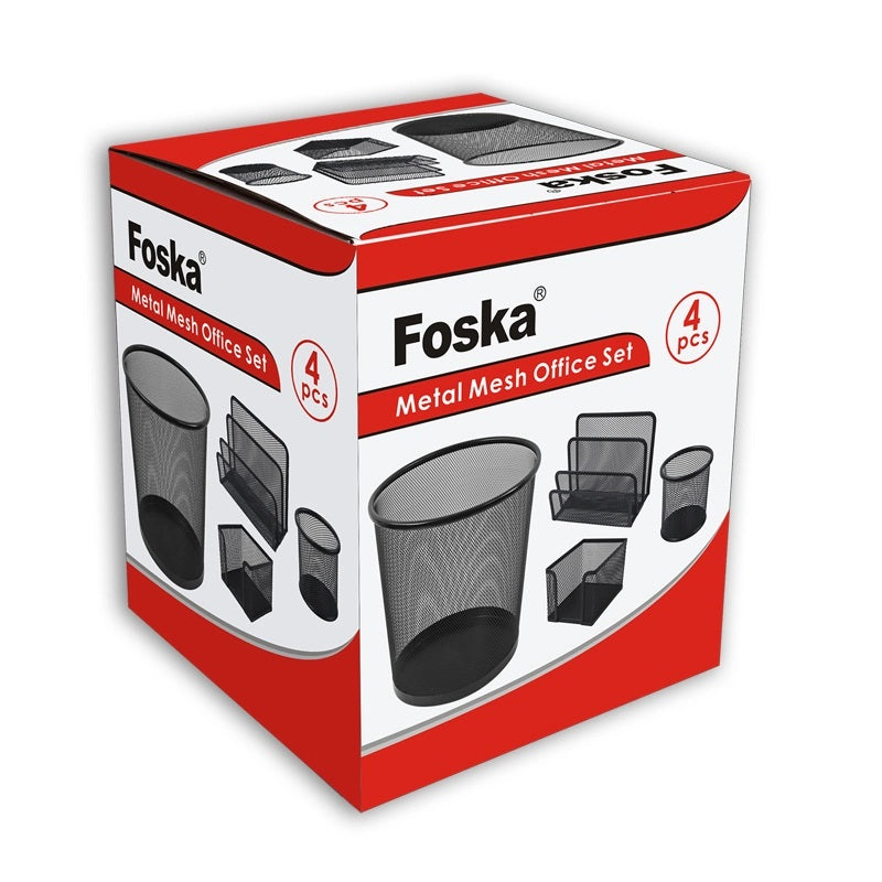4 Piece Wire Mesh Office Desk Organiser Set. Colour: Black. Includes pen pot, waste basket bin, letter holder and memo note block holder. The 4 Piece Wire Mesh Office Desk Organiser Set in black is a sleek and functional collection designed to enhance the organization and aesthetics of any workspace. This set includes four essential items: a pen pot for storing writing instruments, a waste basket bin for tidy disposal, a letter holder to keep mail and documents neatly arranged, and a memo note block holder for easy access to sticky notes or small notepads. Each piece is crafted from durable wire mesh, combining robust construction with a contemporary look that fits seamlessly into both modern and traditional office environments. The unified black colour scheme adds a touch of sophistication, ensuring that these organisers not only serve practical purposes but also contribute to the visual appeal of your desk setup. By providing a designated place for common office items, this set helps reduce clutter and promotes a more efficient, focused work area. Ideal for professionals, home offices, or students, the 4 Piece Wire Mesh Office Desk Organiser Set is a simple yet effective solution for keeping your workspace orderly and stylish. Whether used together for a cohesive look or separately to address specific organisational needs, this set is an invaluable addition to any desk.
