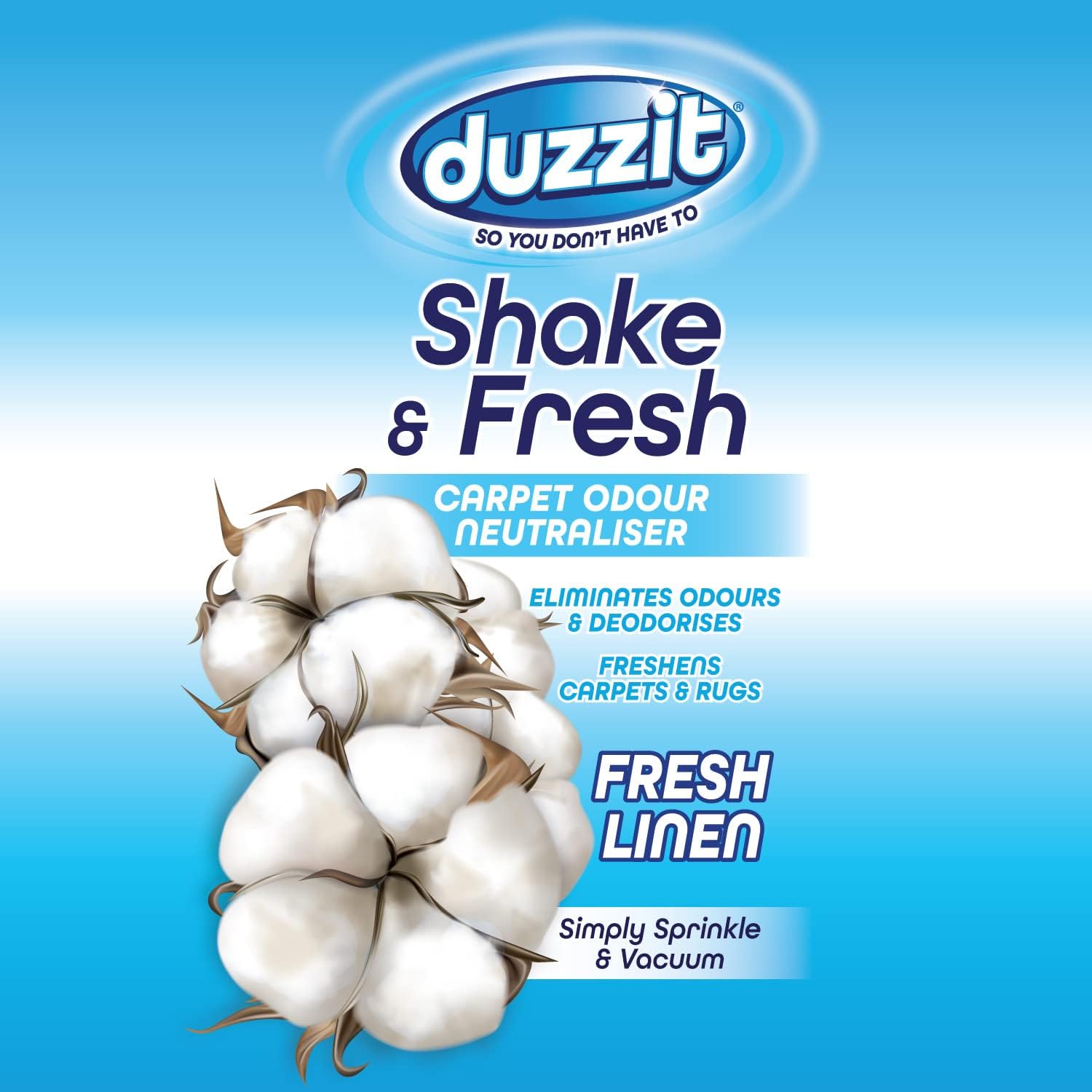 Duzzit Shake & Fresh, simply sprinkle & vacuum to eliminate odours and deodorise carpets, rugs and hallway runners. A single bottle will treat approximately 20 sq. metres. Duzzit Shake & Fresh, eliminates bad odours trapped in carpets, such as cooking odours, tobacco and pet odours. Leaves your room feeling clean and fresh. Do not use on carpet tiles. Duzzit Shake & Fresh, can also be used in household waste bins to keep them smelling fresh, neutralising odours and bad smells. Duzzit Shake & Fresh, is a re-sealable bottle. Open the cap, hold upside down and shake lightly from side to side over a dry carpet or rug. Leave for 5 minutes, vacuum up the powder, leaving your carpet and room smelling clean and fresh. Duzzit Shake & Fresh, Carpet Odour Neutraliser, Fresh Linen 500g. Re-sealable bottle.