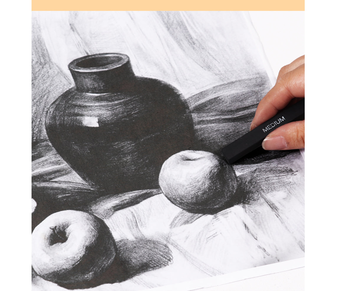 Pack of 6 Compressed Charcoal Stick Set. Stick Size: 10 x 10 x 80mm. Pack contains: 2 soft, 2 medium and 2 hard sticks. Elevate your sketching and drawing endeavors with our Pack of 6 Compressed Charcoal Stick Set, meticulously designed to cater to artists seeking depth and precision in their work. Each set includes a balanced assortment of 2 soft, 2 medium, and 2 hard sticks, each measuring 10 x 10 x 80mm, providing a versatile range to explore various shading techniques and textures. Whether you're laying down broad, sweeping strokes or fine details, the soft sticks glide effortlessly across the paper, while the medium sticks offer a great balance for general sketching. The hard sticks excel in delivering sharp lines and adding fine details to your compositions, making this set ideal for artists who value control and versatility in their medium. Crafted for both seasoned artists and beginners alike, this charcoal set promises rich, intense blacks and a smooth blending experience, perfect for expressive drawings, portraits, landscapes, and more. Dive into the expressive world of charcoal and unleash your creative potential with our Pack of 6 Compressed Charcoal Stick Set, your essential companion for dynamic, impactful artistry.
