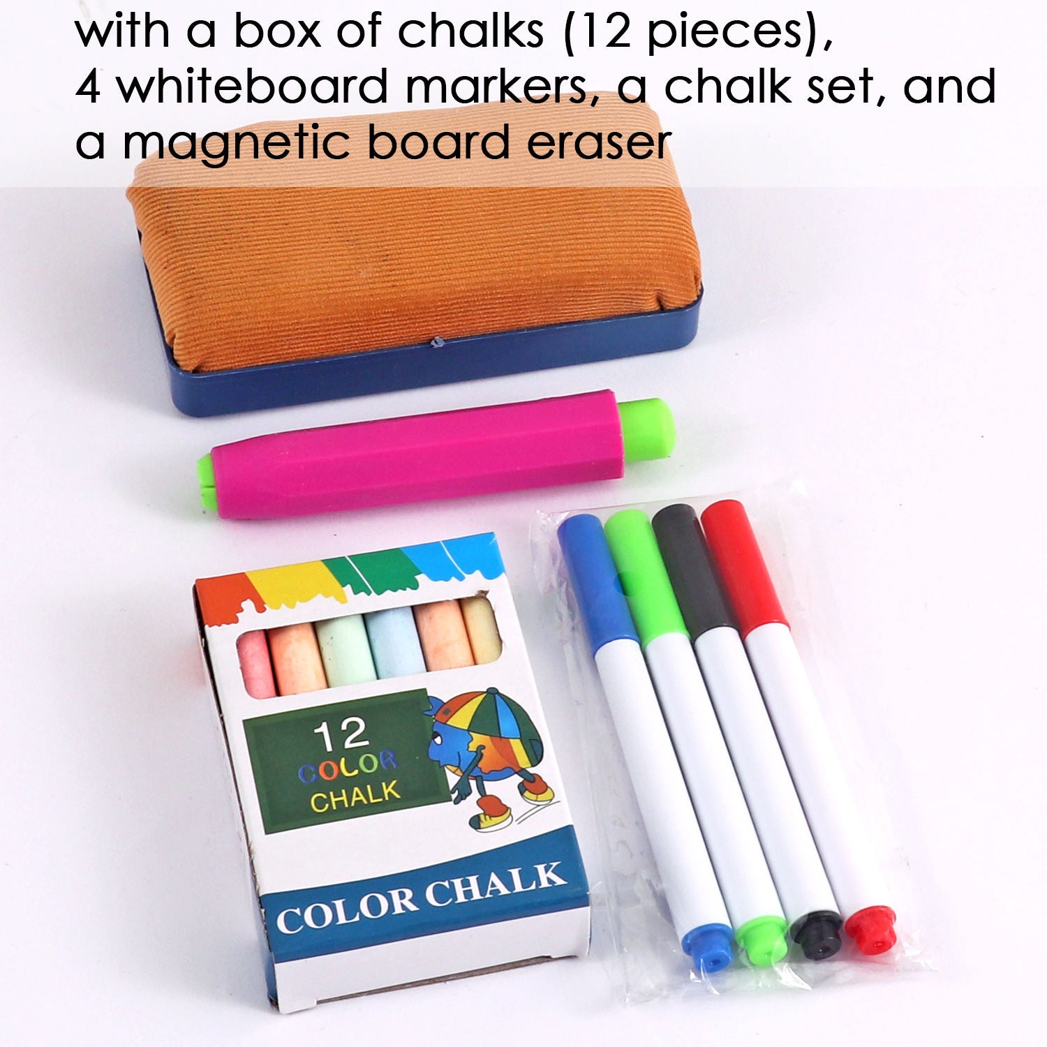 Height Adjustable Folding Wood Easel Whiteboard Black Board 47 x 84.5cm. Panel size: 47*7*84.5cm, Height: 60-108cm. Includes a box of chalks (12pieces), 4 whiteboard markers, a chalk set and a magnetic eraser. Introducing our Height Adjustable Folding Wood Easel Kids Drawing Board, a versatile and interactive platform for young artists to explore their creativity. With a panel size of 47 x 84.5cm and adjustable height ranging from 60 to 108cm, this easel grows with your child, accommodating their changing needs and preferences. Crafted from sturdy wood, it provides a stable and durable surface for drawing, painting, and writing activities. The set includes a box of 12 chalks, 4 whiteboard markers, a chalk set, and a magnetic eraser, offering a variety of mediums for artistic expression. Whether it's drawing, practicing letters, or playing educational games, this drawing board inspires endless hours of fun and learning for children of all ages.