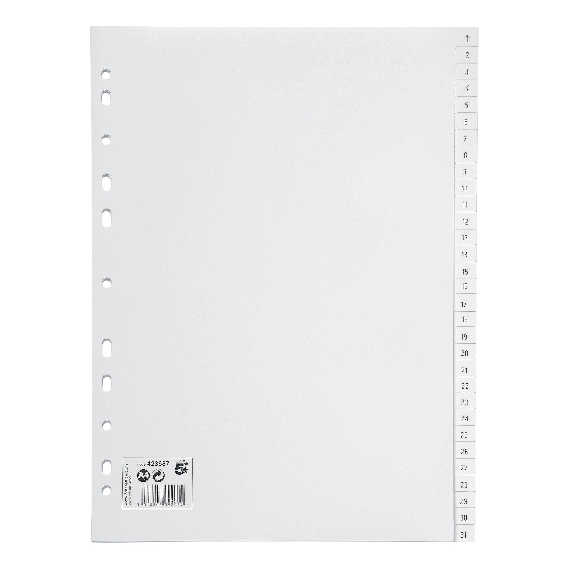 White 1-31 divider made from 130 micron polypropylene.5 Star™ Office is a competitive range of office stationery. These A4 file dividers made from polypropylene contain 1-31 separate tabs with multipunched holes to keep your documents organised in your ring binder or lever arch file. File dividers are a convenient way of keeping track of your documents when you have them stored in folders. The file dividers from 5 Star™ Office are made from quality polypropylene for additional durability and contain 31 separate sheets with white coloured tabs and black text to keep your work separated. Suitable for all types of folders and available as a single set of dividers.