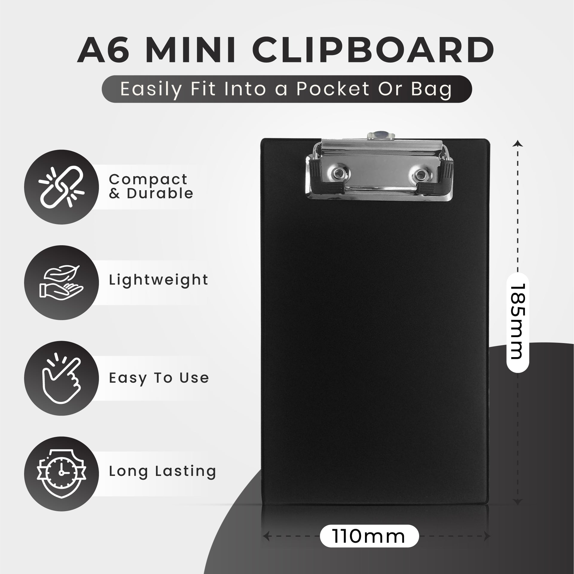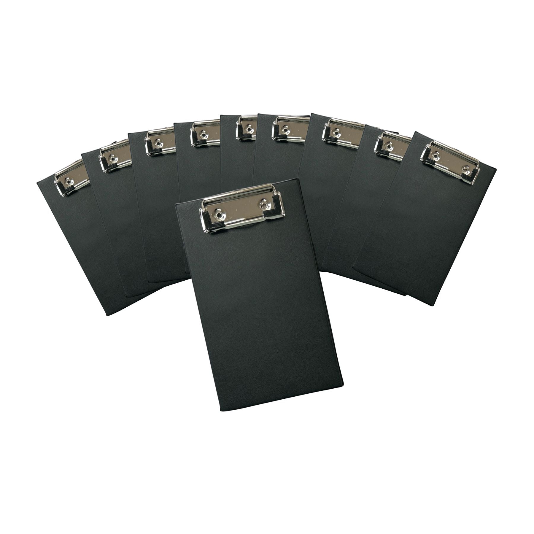 Pack of 10 A6 Mini Clipboard. Dimensions: 18.5 x 11cm. PVC Covered Mini Pocket Hardback Clipboard. Ideal for Bars, Restaurants, Retail Shops, Bills etc. Includes Hanging Hole.