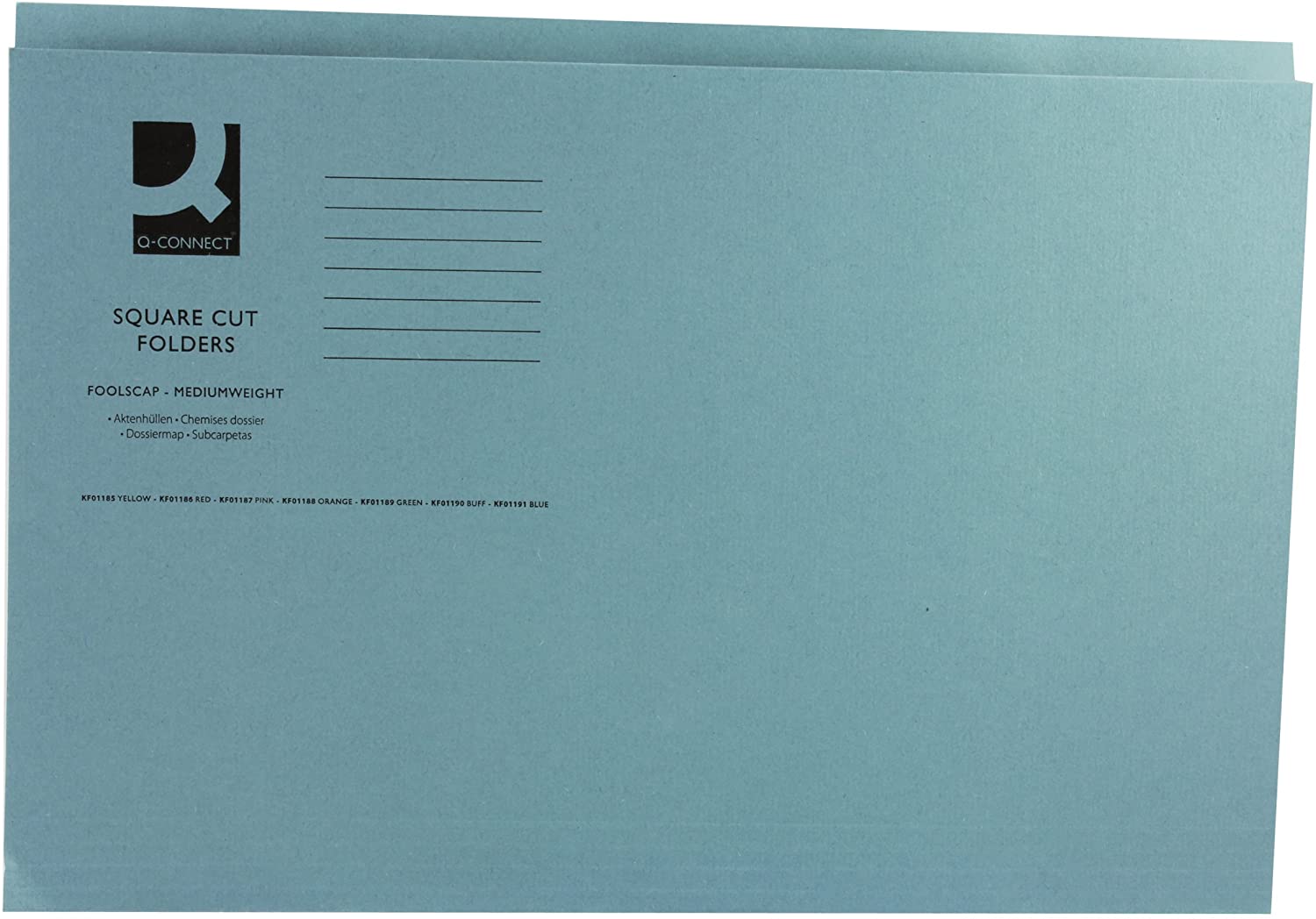 Q-Connect Square Cut Folders. Pre-creased folders manufactured from 270gsm manilla ideal for storing large quantities of paper. Features include a large labelling area and pre-punched slits to accommodate standard filing clips. Foolscap - Blue.