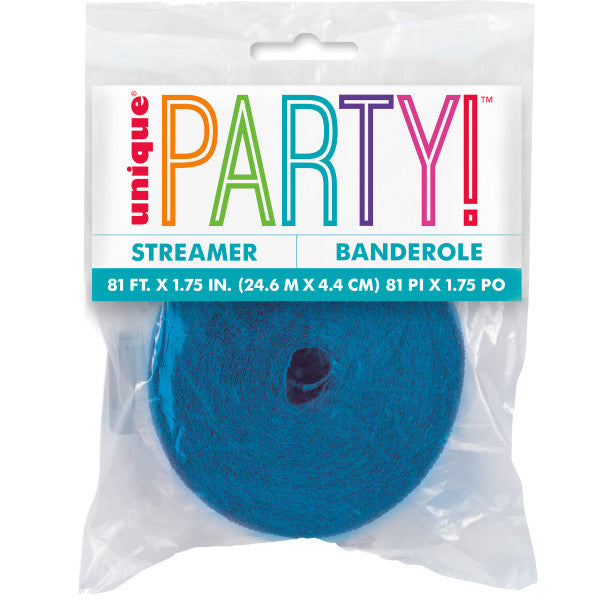 81ft Royal Blue Crepe Streamer. This classic crepe streamer design can easily mix and match with your other colourful decorations. This product is perfect for weddings, events, banquets, and decoration for parties. This product is made of quality crepe paper that is easy to assemble and use. Made with environment friendly crepe paper that is disposable and biodegradable. Size 81ft x 1.75inches.