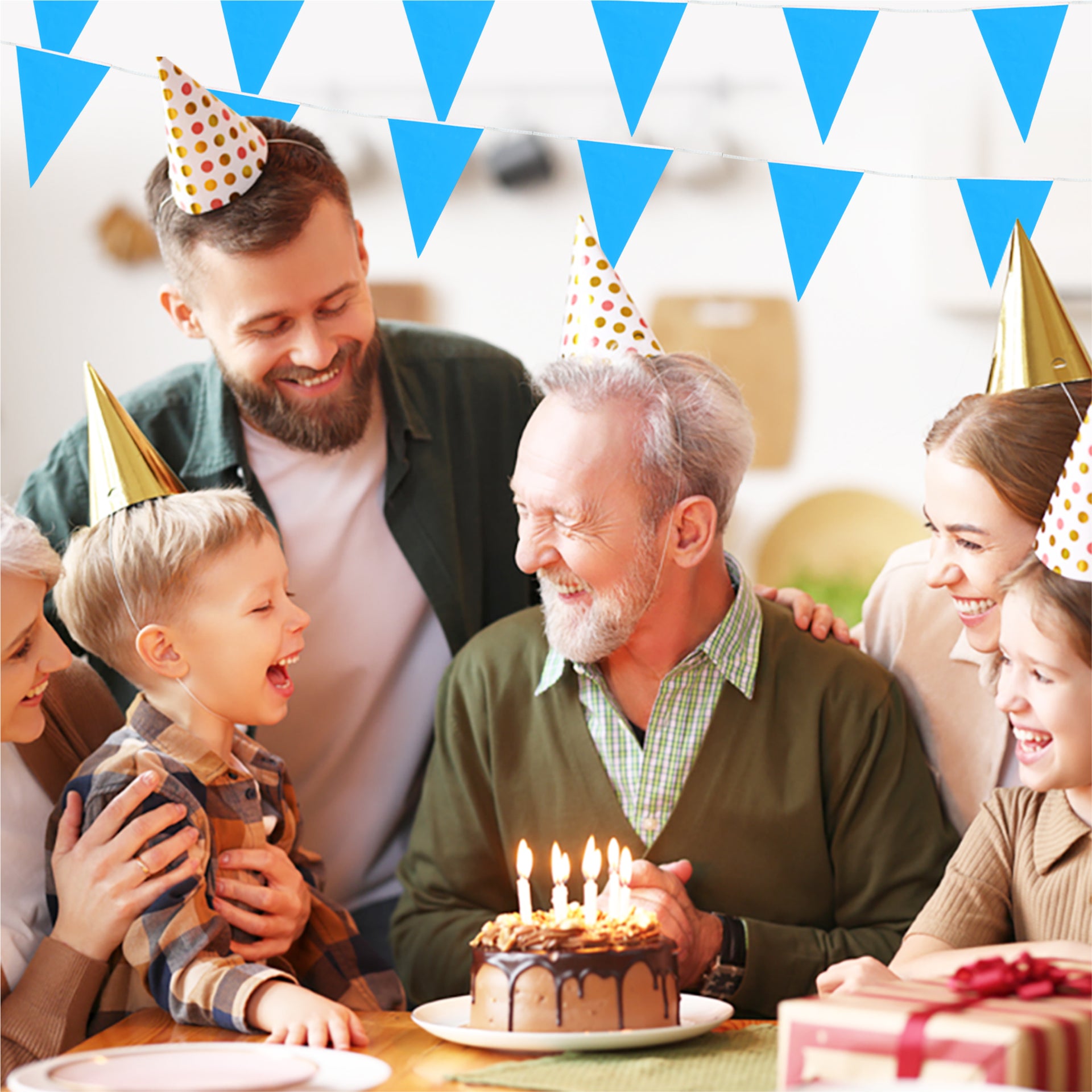 Pale Blue Bunting 10m with 20 Pennants. This bunting measures 10m and has 20 pennants. Material: PVC. Approx size of each Flag/ Pennant 30x20cm.