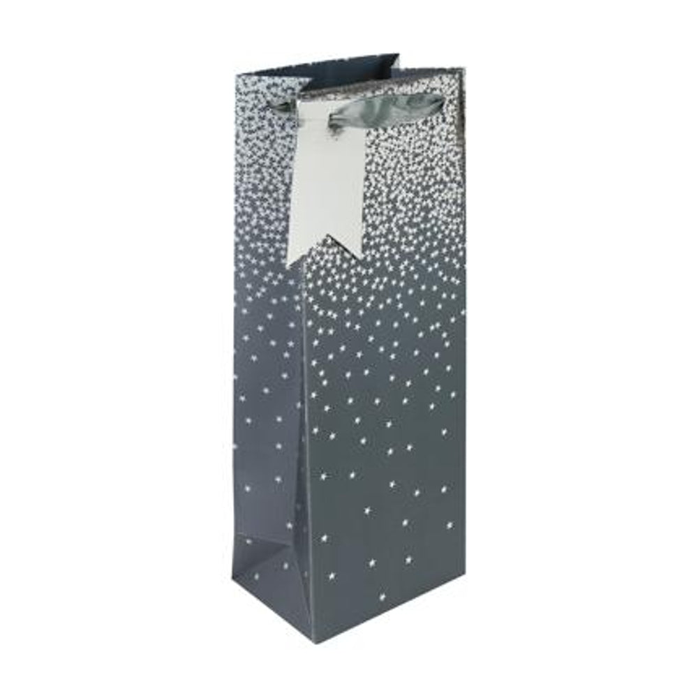Charcoal Ombre Bottle Gift Bag. Fantastic Grey Gift Bag with Grosgrain Handle and Silver Tag. Foil Finish with Plain Silver Print Inside. Perfect for your Gifts for all Occassions Including Birthdays, Weddings, Christmas and Father's Day. Product size: 355 x 127mm.