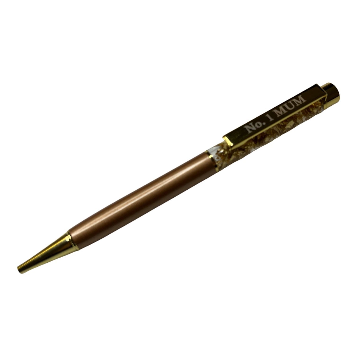 No. 1 Mum Captioned Gold Leaf Ballpoint Gift Pen. Gold leaf effect ballpoint pen with caption on clip. Comes complete with display case. Ideal gift for Birthdays, Christmas and party favours.