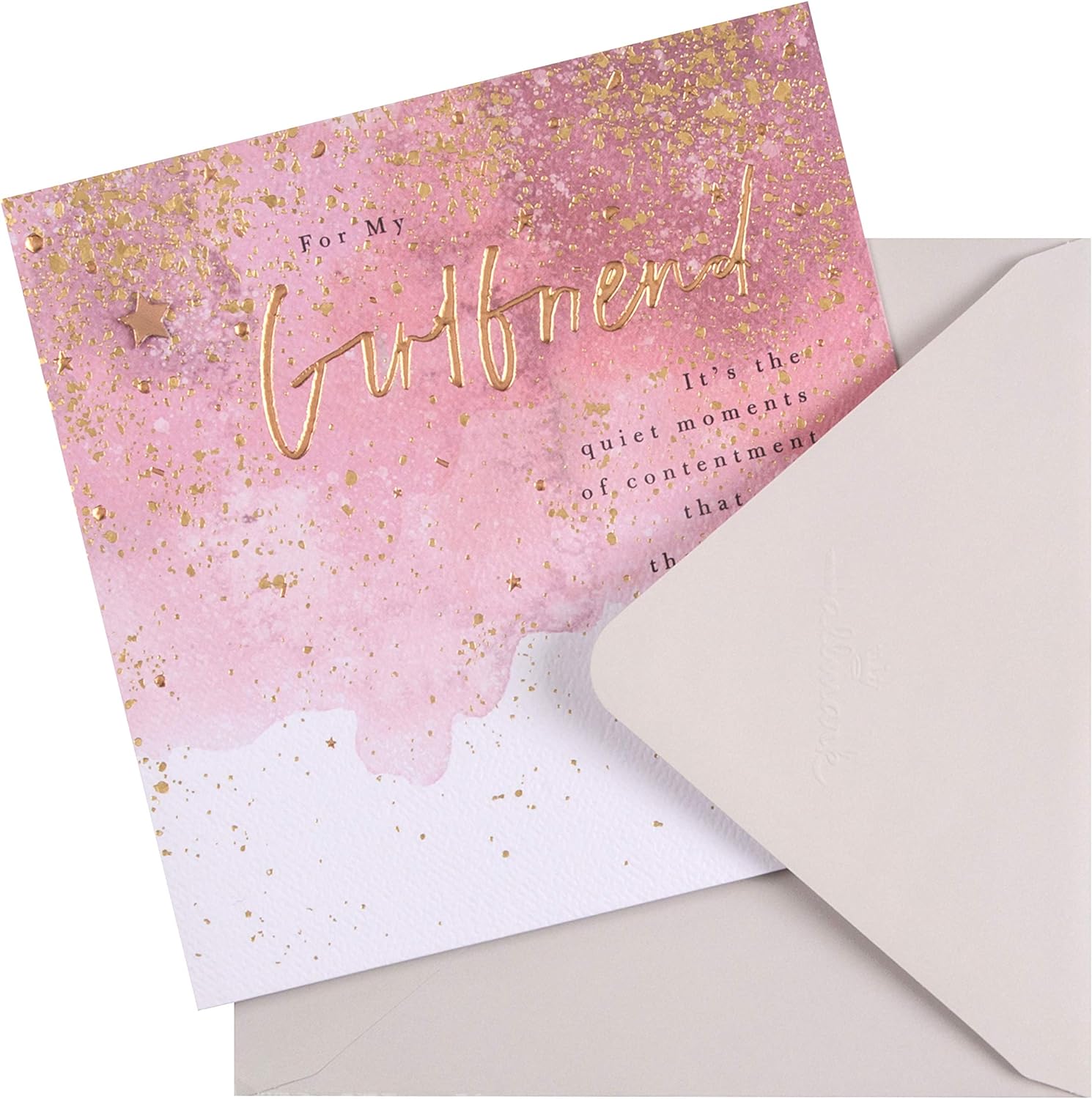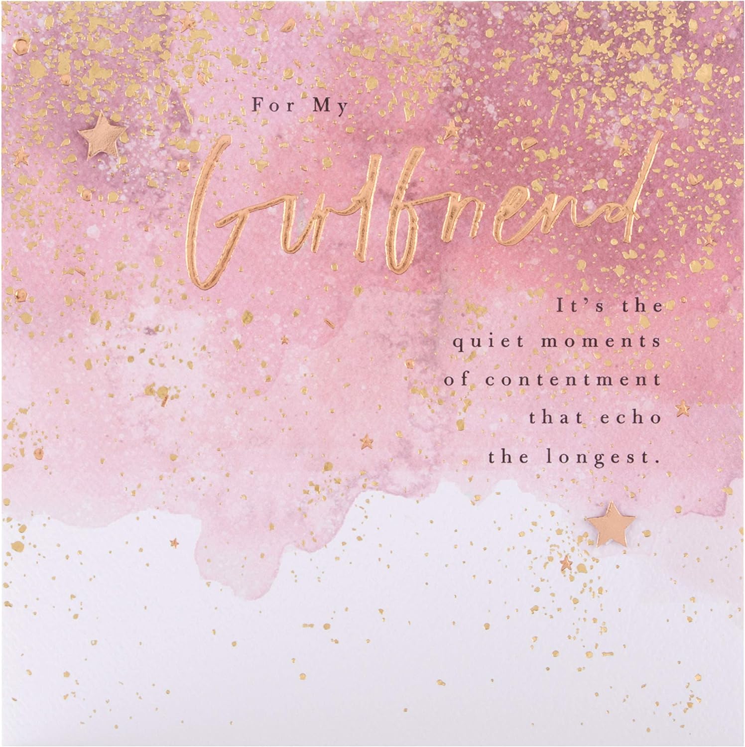 Let your Girlfriend know just how much she means to you with this beautiful and heartwarming birthday card from Hallmark. Gold foil lettering and design details. Gold Star attachments. Textured board. Co-ordinating printed envelope Message reads: front: for my Girlfriend it's the quiet moments of contentment that echo the longest. Inside: of all the amazing memories we're making, my favourite are just the everyday things we share. Happy Birthday Measures 16cm by 16cm,