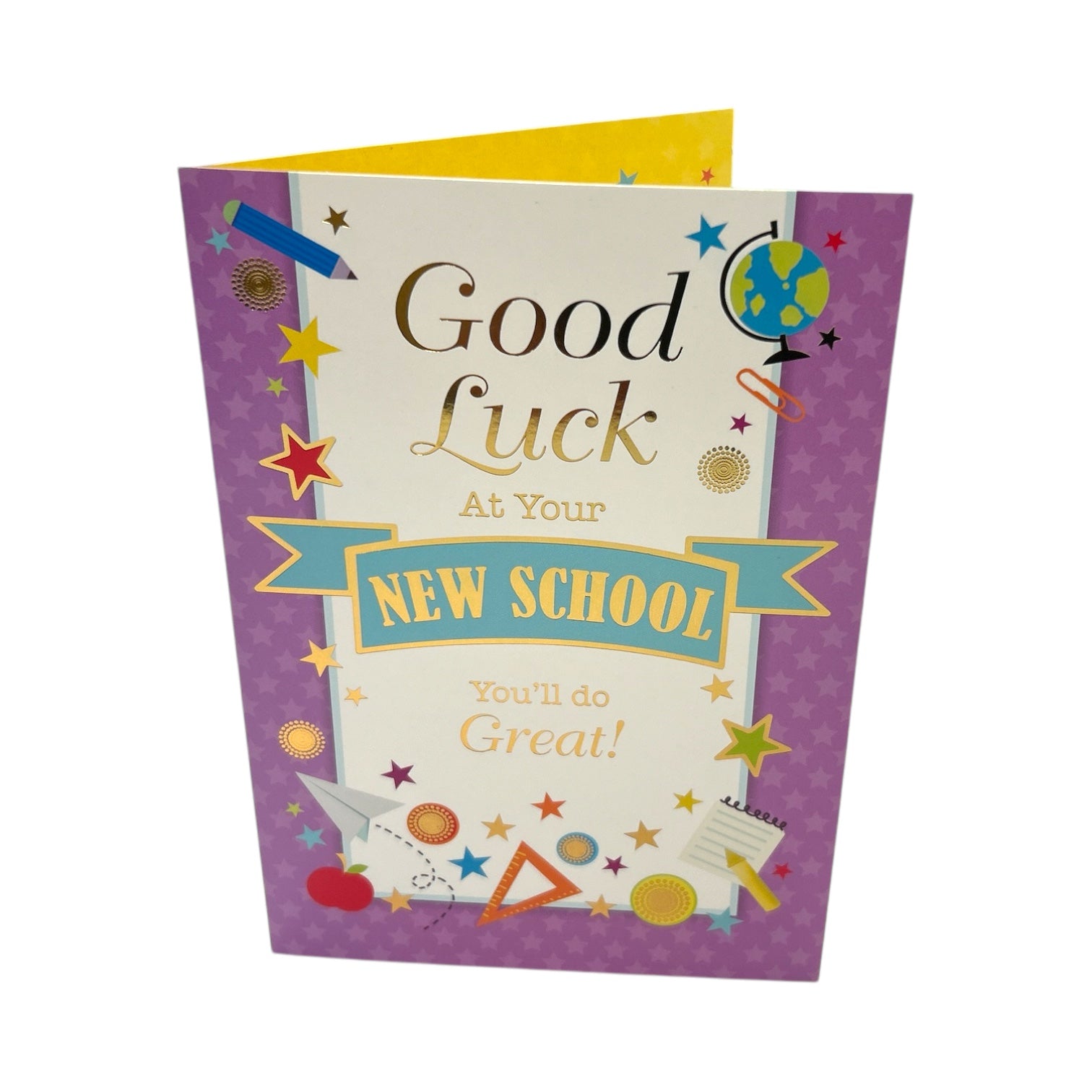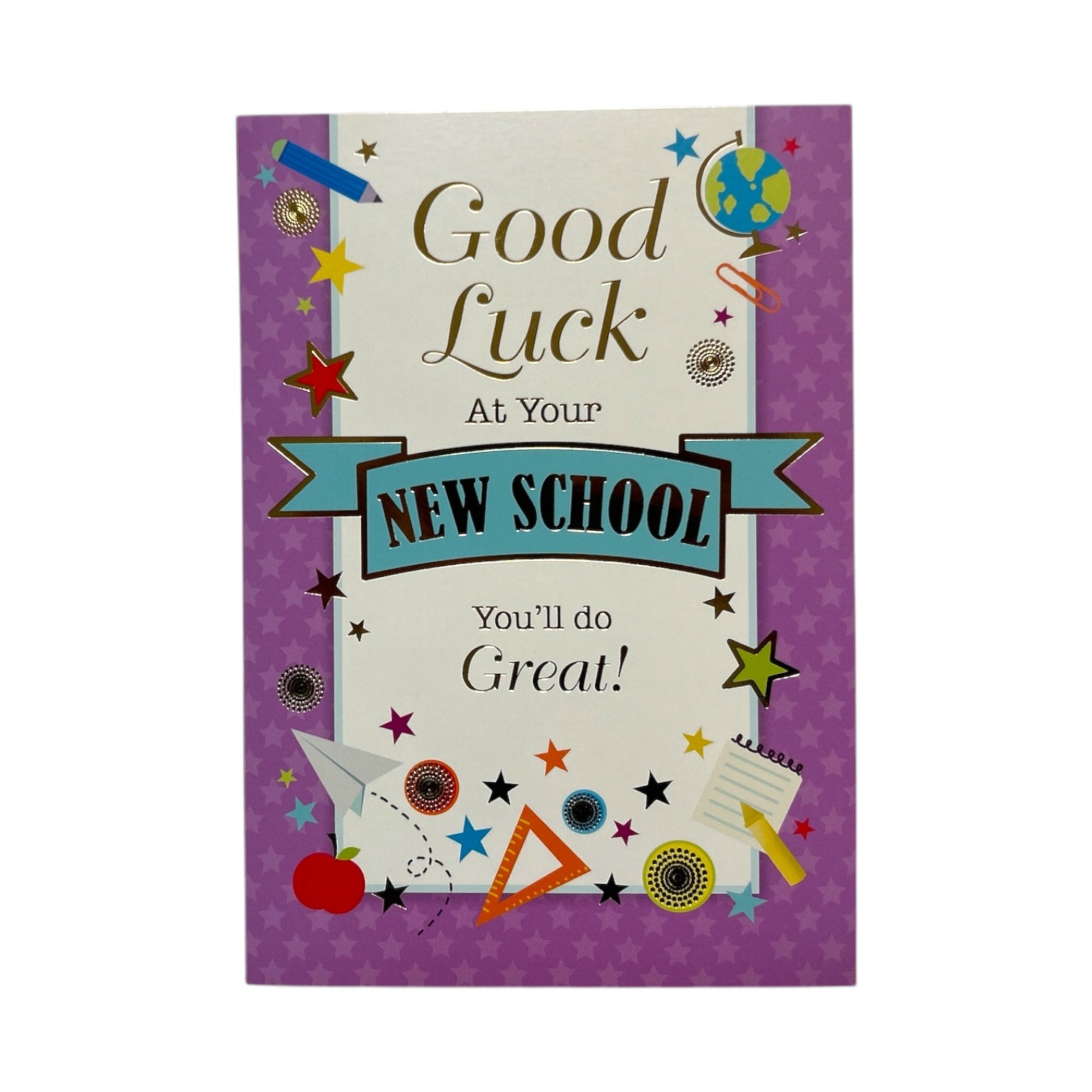 he text is styled in a mix of elegant and bold fonts, with a blue and gold banner highlighting "NEW SCHOOL." The background also includes small stars and dots, adding to the cheerful and supportive theme. This card is perfect for wishing someone success and confidence as they begin their new school journey. Comes complete with a coordinating envelope. Card size: Approx. 19.5 x 14 cm.