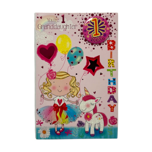 Granddaughter Age 1 Girl And Unicorn Design Juvenile Birthday Card With Badge