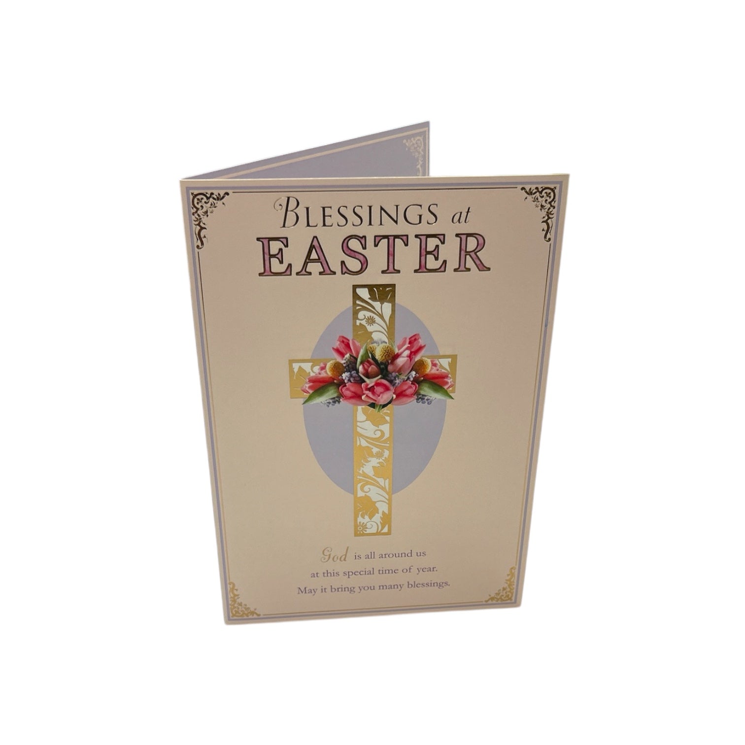 Celebrate Easter with this beautifully designed greeting card, perfect for sharing warm wishes with all the family. Featuring a stunning arrangement of flowers on cross, this elegant card is adorned with embossed details, and delicate foil accents, adding a touch of sophistication. The heartfelt message on the front reads, "Blessings At Easter" making it a thoughtful choice for your loved ones. Complete with a coordinating envelope, this card is a wonderful way to spread joy and celebrate the season. Card size: Approx. 19.5 x 14 cm.