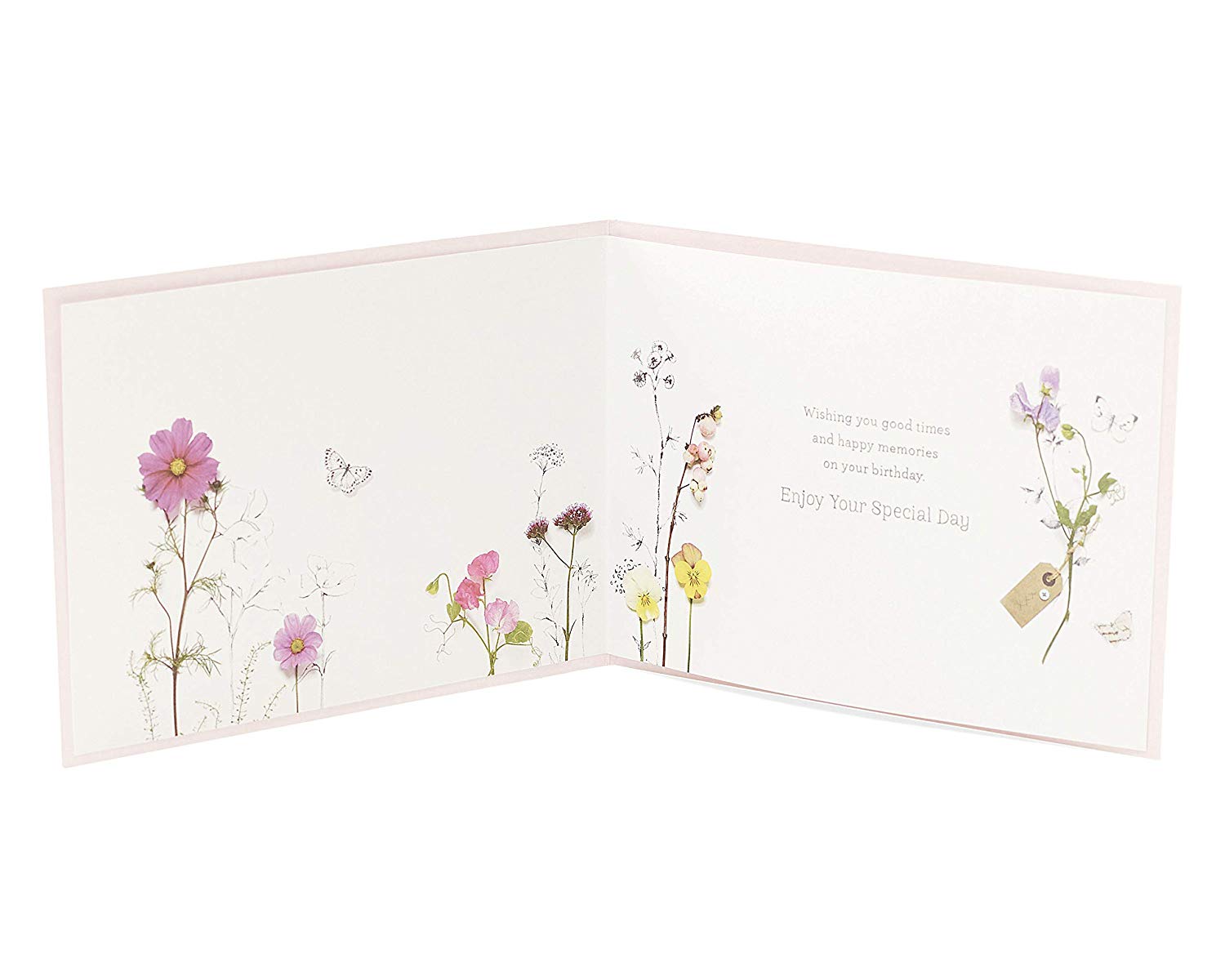 A beautiful card with delicate, handpicked meadow flowers that's just for them on their special birthday. Inside Message: Wishing you good times and happy memories on your birthday. Enjoy Your Special Day. Envelope Included. Size: 127 x 178 mm.