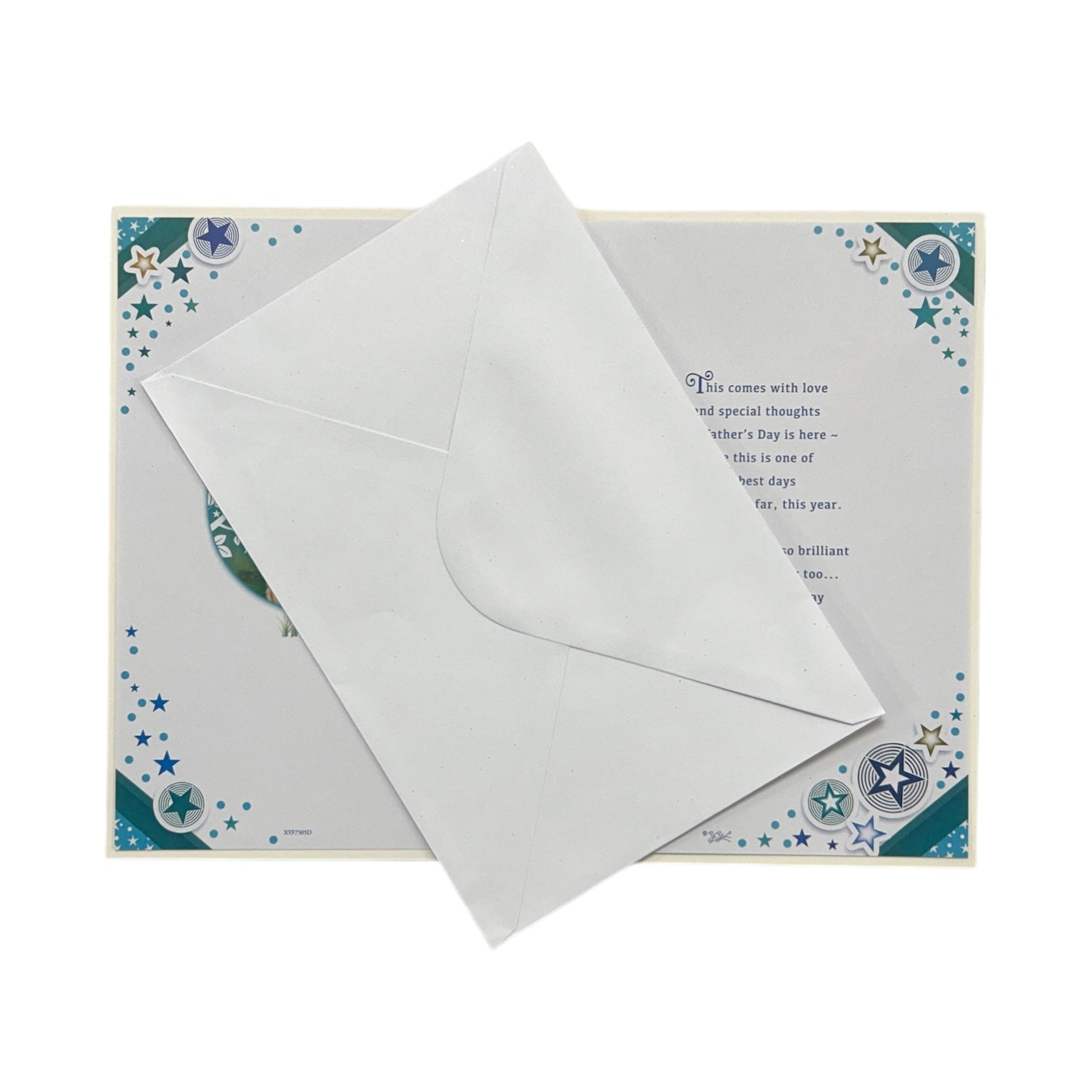 Show your appreciation and love with this Father's Day Card, a perfect way to celebrate the amazing man he is. The front design features an adorable teddy bear sitting with a laptop and a gift box, symbolizing care, dedication, and the special moments shared. Embossed elements, shimmering foil details, and bursts of stars add a touch of charm and warmth to the design. Inside, a sentimental wishes message expresses gratitude and admiration for all the love and support he gives every day. This card is a heartfelt way to make his Father's Day truly special. The card comes with a coordinating envelope. Card Size: Approx. 27 x 18 cm.