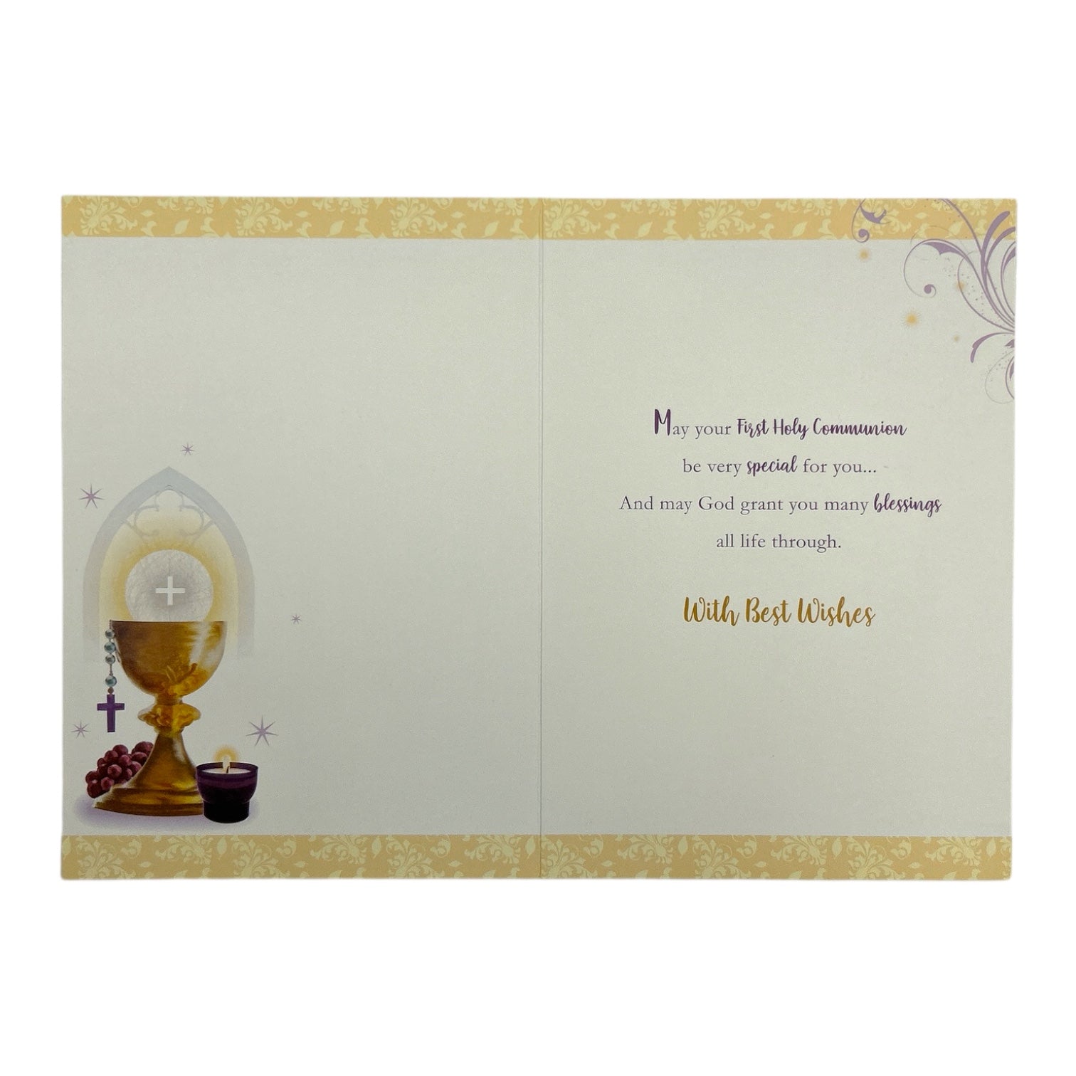This elegant and reverent First Holy Communion card highlights the sacred beauty of the occasion. At its center, a golden chalice holding the Eucharistic host is adorned with delicate floral designs, symbolizing faith, purity, and blessings. Beside the chalice, a small dark purple candle adds a touch of solemnity and devotion. The light cream/beige background features intricate decorative swirls and floral patterns, creating a sense of grace and spirituality. The text, written in a traditional and ornate font, stands out clearly, conveying a meaningful message that emphasizes the religious significance of this important milestone. Inside, a heartfelt message extends blessings, prayers, and encouragement for a lifelong journey of faith. The card comes with a coordinating envelope. Card size: Approx. 19.5 x 14 cm.