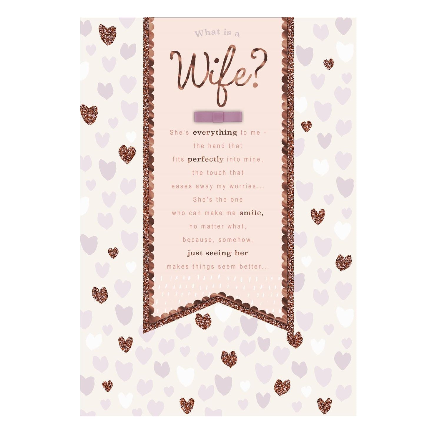 Glitter Finished Heart Design Wife Anniverssary Card. Message inside reads: 1st page: 'She's right at the centre of all my favourite memories and all my plans for the future, because, as long as we're together, I know I have everything I could ever need...'. 2nd Page: 'She is my partner, my always and forever the love of my life'. Finishes: 3D, Glitter, Ribbon. Envelope: White. Size: 268 x 186mm.