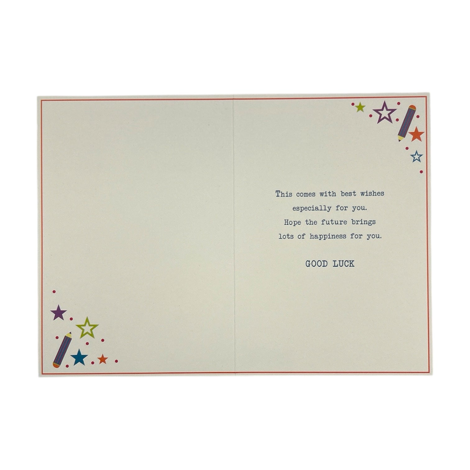 Good Luck at University Stars Design Greeting Card. Wish them the very best on their new adventure with this stylish university good luck card. Featuring gold and multicoloured stars alongside charming pencil illustrations, the design is cheerful and celebratory—perfect for marking such an exciting milestone. Embossed details and foil accents add an elegant touch, while the card comes complete with a coordinating envelope. Approx. size 19.5 x 14 cm.