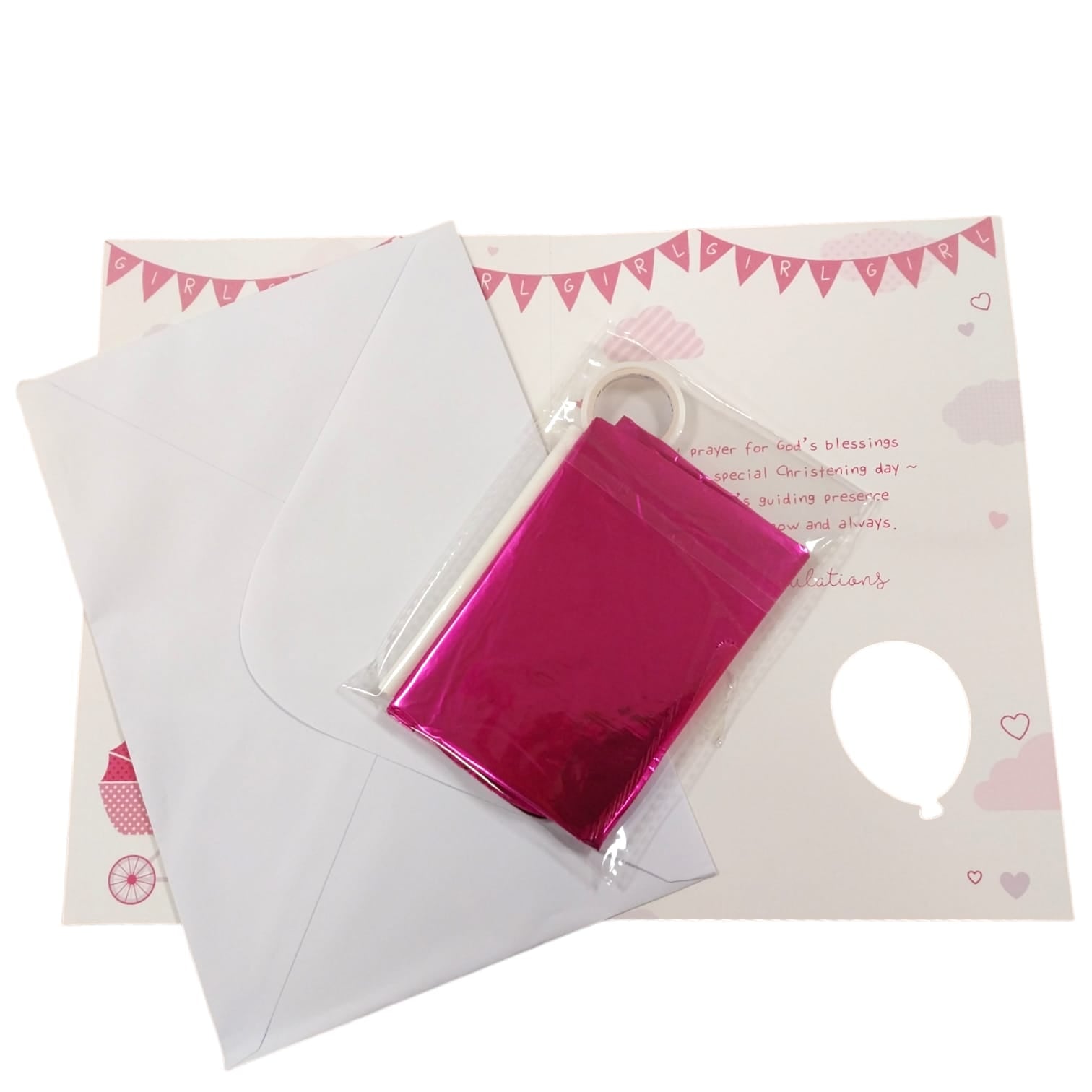 Upon opening the card, the recipient will find a heartfelt message extending warm congratulations to the parents on the christening of their baby girl. The message may express blessings, joy, and best wishes for the baby's future, accompanied by tender and nurturing sentiments. The card comes with four pink Baby foil balloons, adding an extra touch of sweetness and celebration to the christening greetings. A straw is provided for inflating the balloons, ensuring ease of use and convenience. Additionally, a 2-meter ribbon is included for hanging the balloons, allowing for effortless display to enhance the atmosphere of the christening celebration. The card measures 230x150mm. It is specified that the balloons are for air fill only, ensuring they cannot be filled with helium. Designed by Balloon Boutique, renowned for their contemporary and high-quality products that infuse special occasions with elegance and warmth, this greeting card with pink baby foil balloons is sure to be a cherished keepsake for the family celebrating their baby girl's christening.