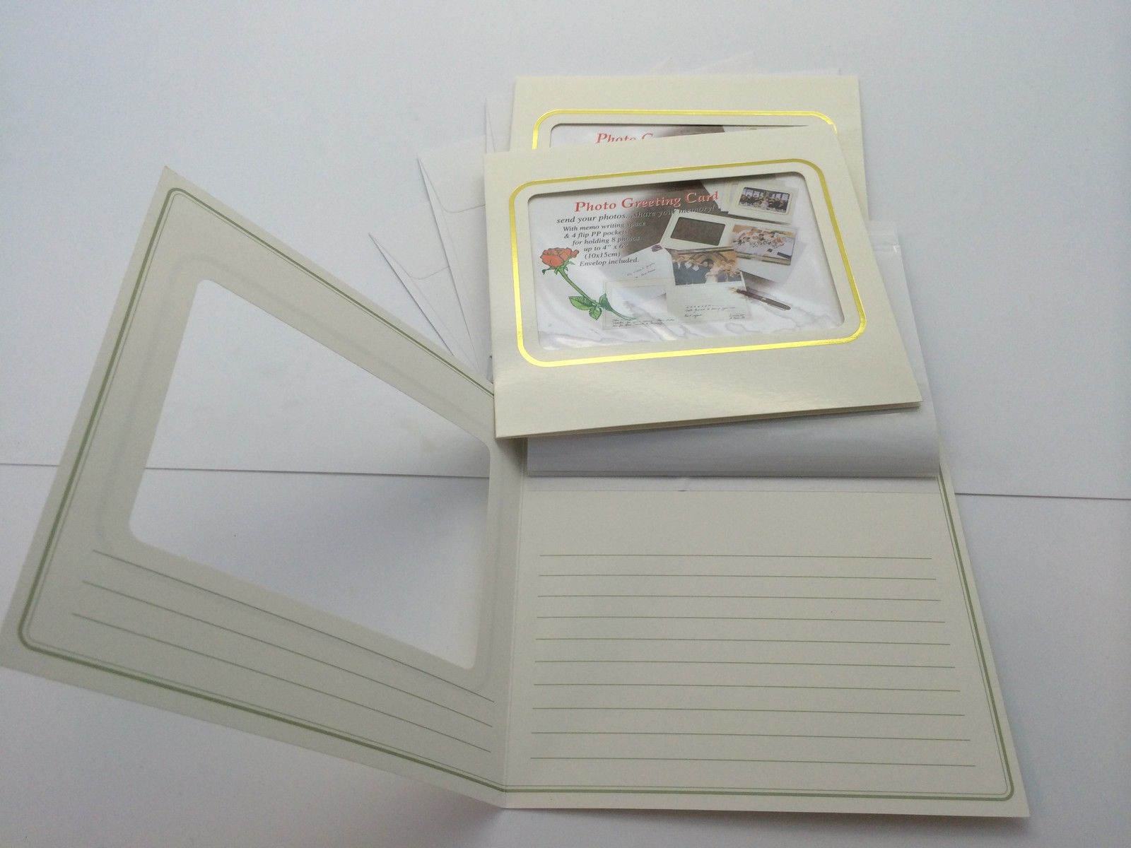 Pack of 3 (3x4x6cm) sized Photo Greeting Card. 4x(10x15cm) sized thin Plastic covers which place your photos safely. 3 strong outer paper covers can be use for presents. External memo writing space.