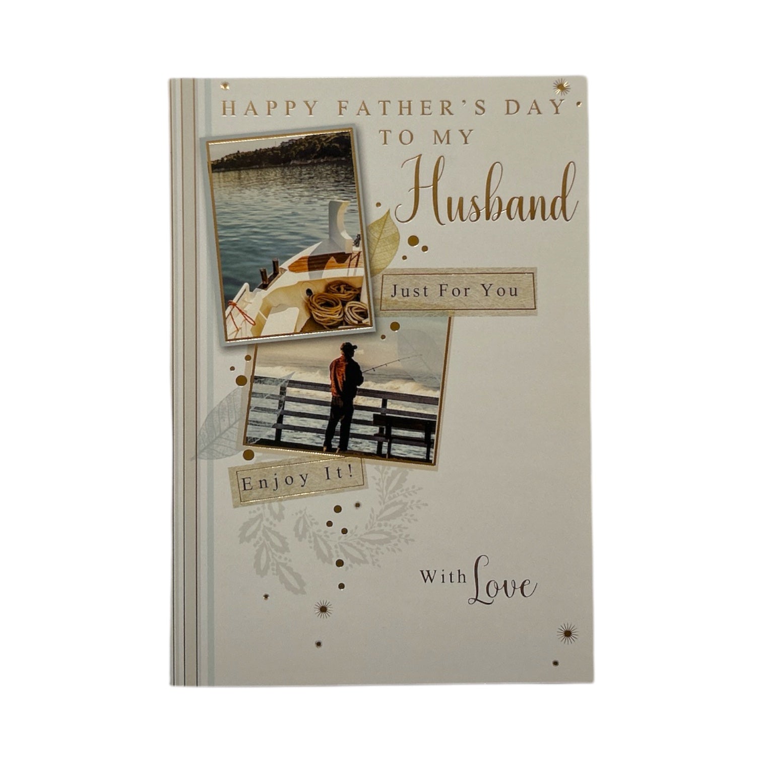 This father's day card design is complemented by two beautifully framed images: one showing a peaceful lakeside scene with a boat, and another featuring a man fishing off a wooden pier. These visuals evoke a sense of relaxation and leisure, making the card ideal for dads who enjoy the outdoors, boating, or fishing. Perfect for Father's Day, this card celebrates a love and treasured memories. The card comes with a coordinating envelope. Approximate size: 19.5x14cm.
