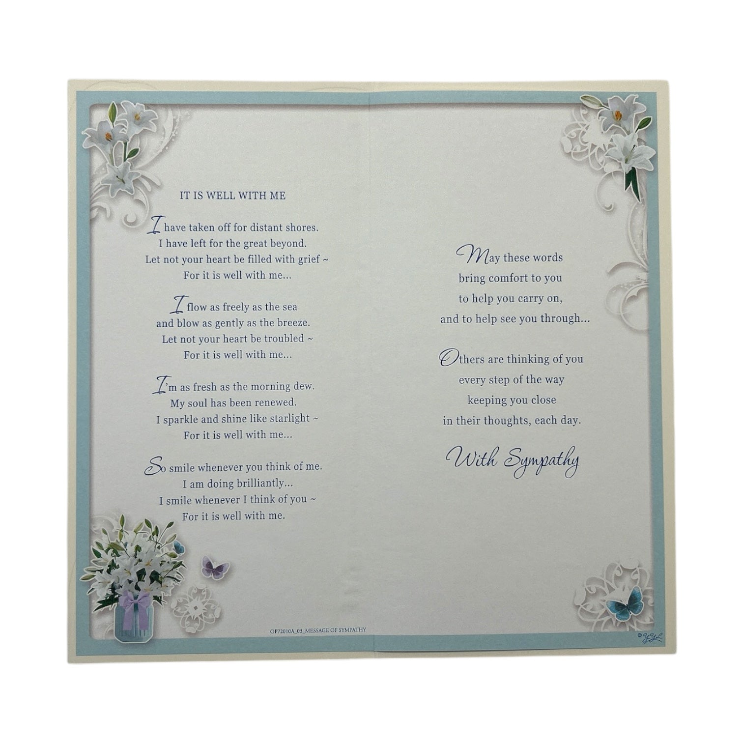 The Sympathy Card with Envelope is a thoughtful way to convey your deepest condolences. Featuring a serene white flower pot design, the card brings a sense of peace and remembrance, offering a comforting touch during a difficult time. The front of the card includes a heartfelt condolence verse that gently expresses your sympathy. Inside, the design continues with the same white flower pot motif, along with a printed sympathy verse that offers words of comfort and support to the recipient. This card comes with a coordinating envelope. Approximate Size: 9" x 4.75" (23cm x 12cm)