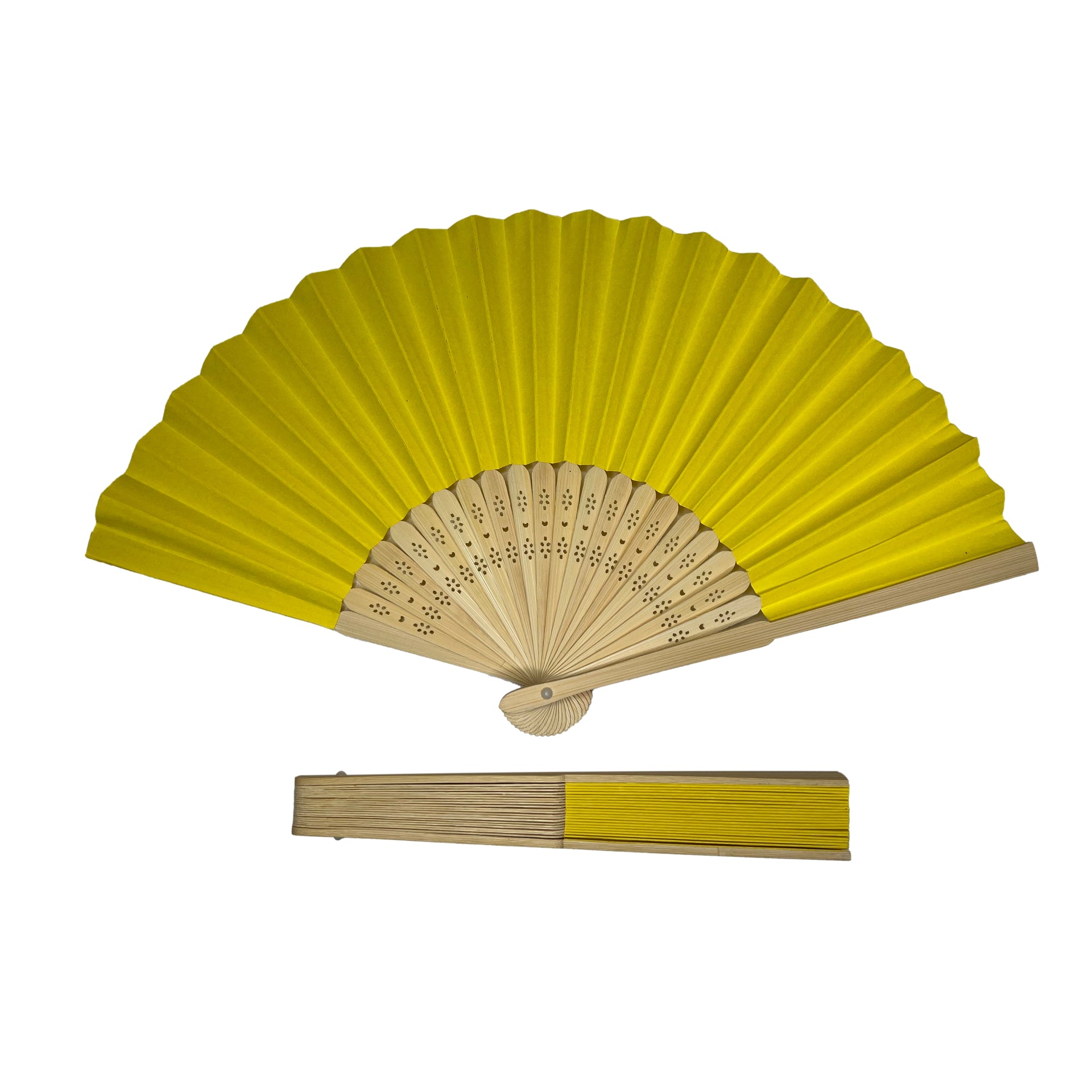 Yellow Paper Foldable Hand Held Bamboo Wooden Fan by Parev. With 23 Pieces of Bamboo Ribs. Size open: 21cm x 37cm approx. Great for decorations, weddings and summer events to keep cool. Perfect for indoor and outdoor events. The fans are easy to use and can be opened and closed with a simple flick of the wrist. The bamboo handle is lightweight and comfortable to hold, making it easy to carry with you wherever you go. Available in a wide range of colours from the Parev range.