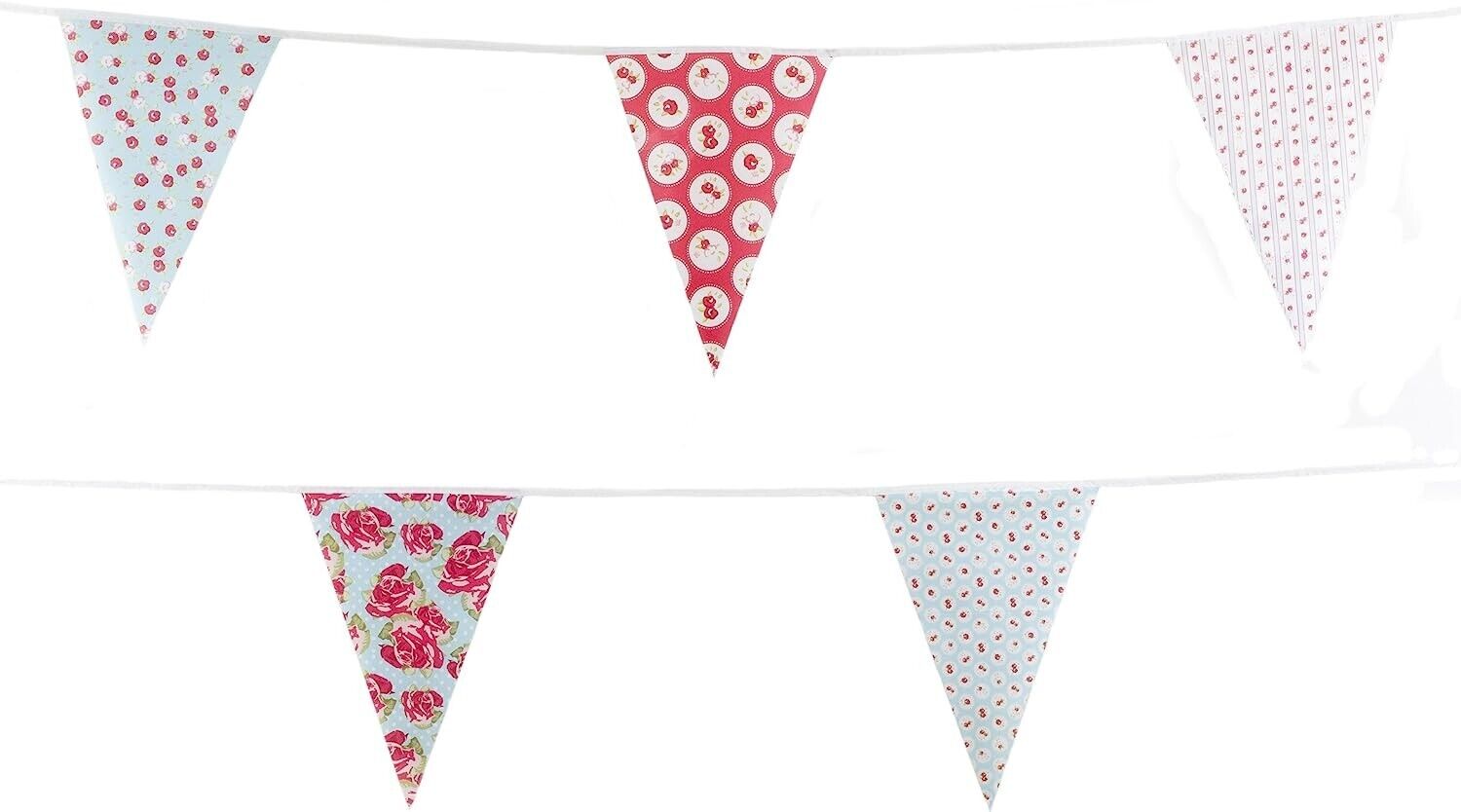 Red and Baby Blue Shabby Chic Vintage Print Bunting 10m with 20 Pennants. This bunting measures 10m and has 20 pennants. Material: PVC. Approx size of each Flag/ Pennant 30x20cm.