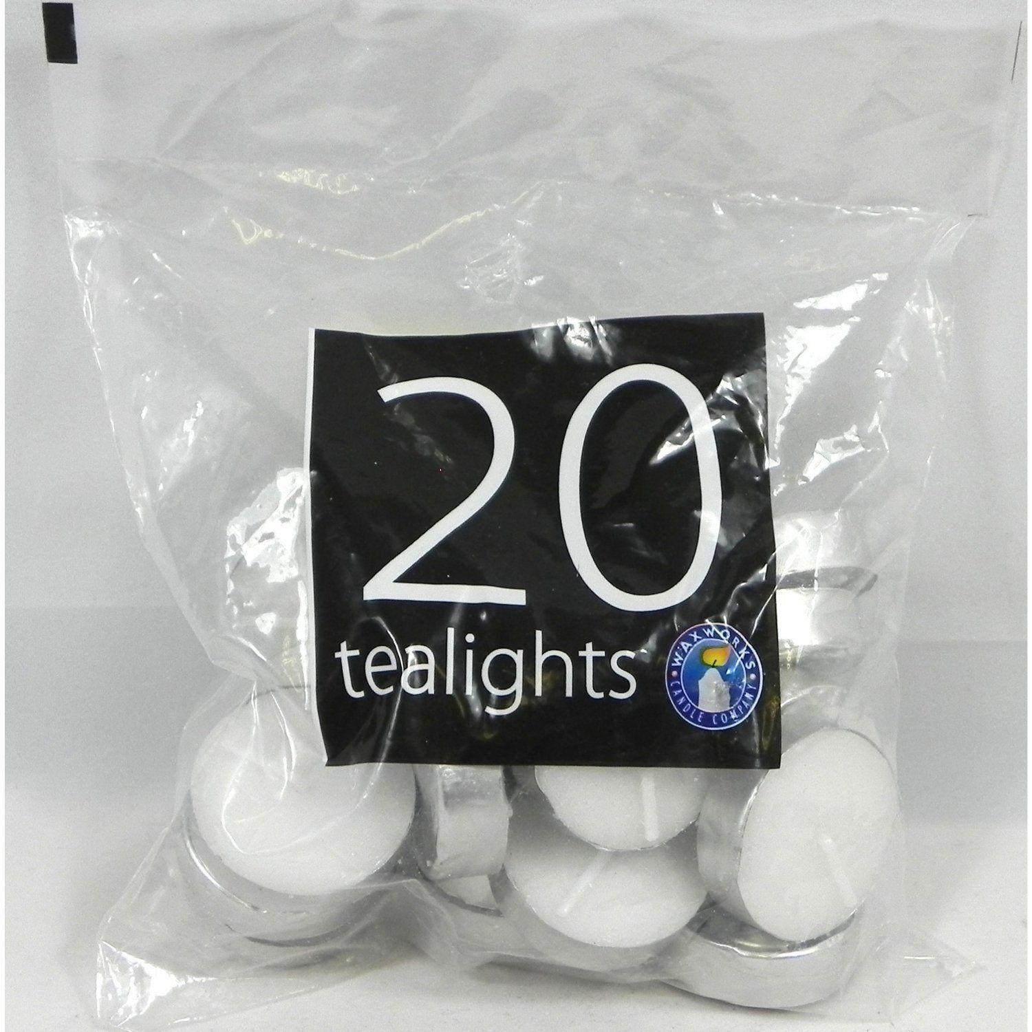 This is a pack of 20 white tealight candles. Each candle typically lasts for approximately 2.5 hours. Suitable for creating ambiance in various settings like dining tables, fireplaces, or bathrooms. Made of wax and typically come in aluminum cups.