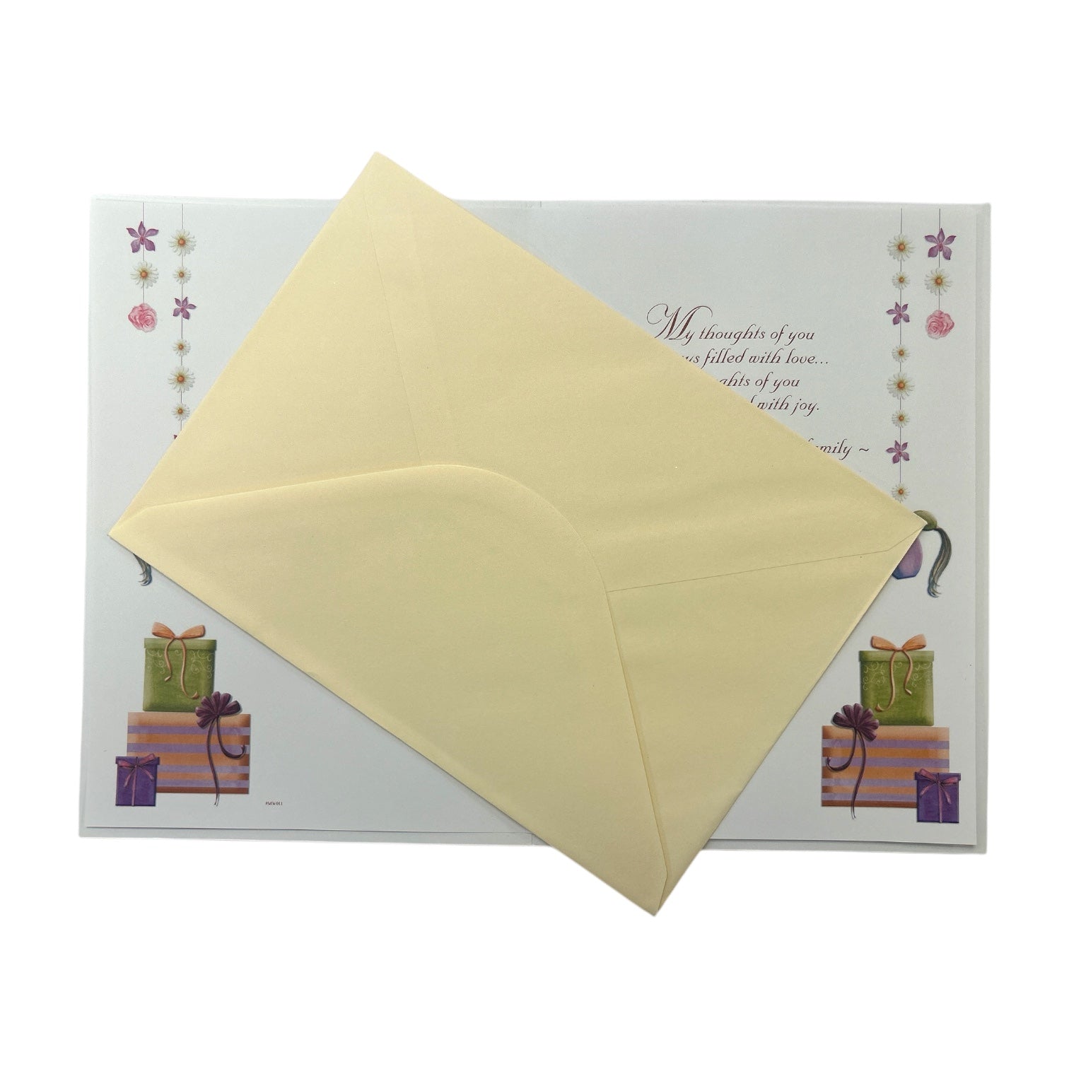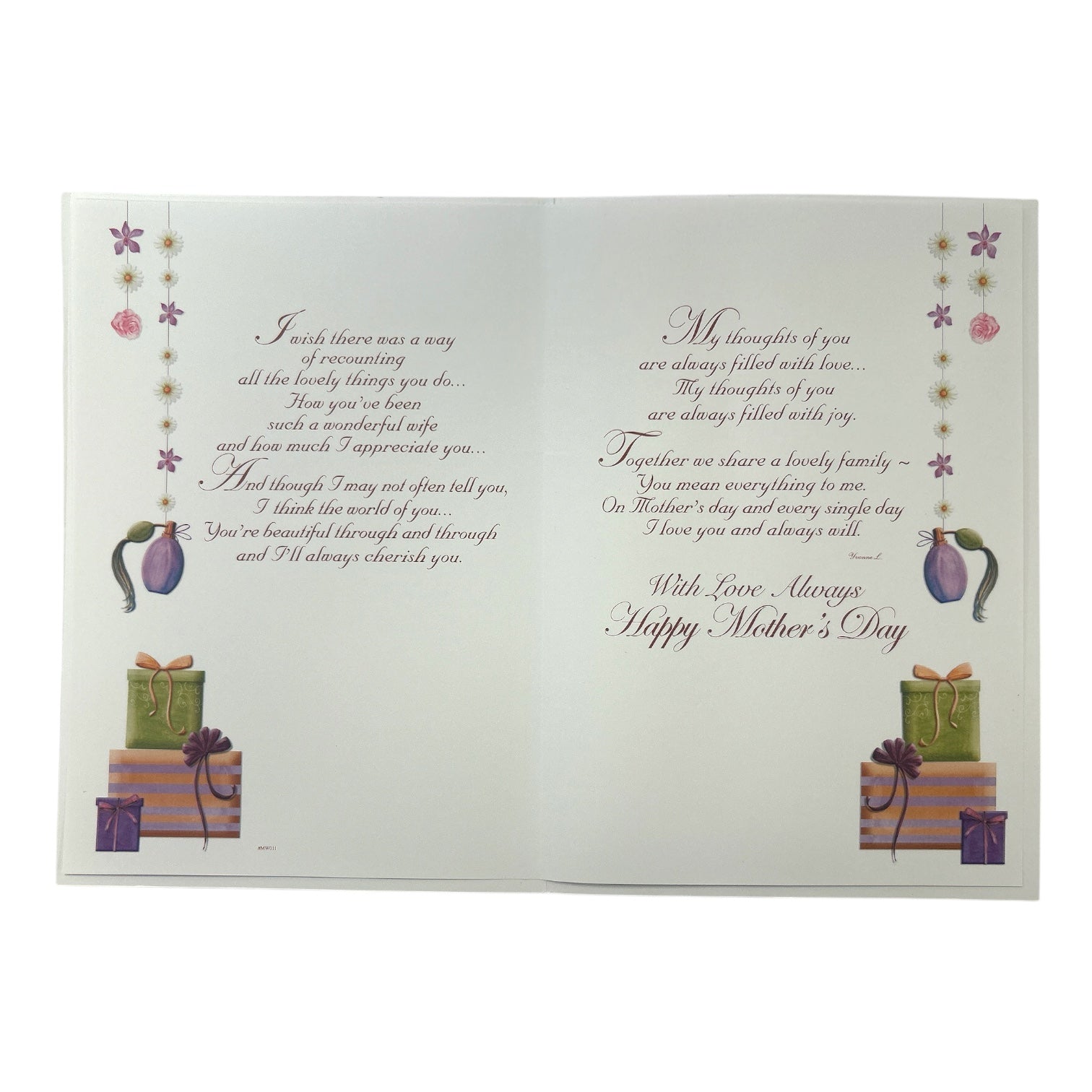 This elegant Mother's Day card features a stylized illustration of a woman in a flowing purple gown, exuding grace and sophistication. Surrounding her are delicate hanging flowers and charming gift boxes in shades of green and purple, adding a decorative and celebratory touch. The floral and ornamental design enhances the card’s refined aesthetic, while the soft, even lighting highlights the intricate details of the dress and accessories. The warm and festive atmosphere makes this card a perfect tribute to a beloved mother, expressing love, appreciation, and admiration on her special day. Dimensions: approx 25cm x 18cm. See Images for inside verse. Card supplied with envelope.